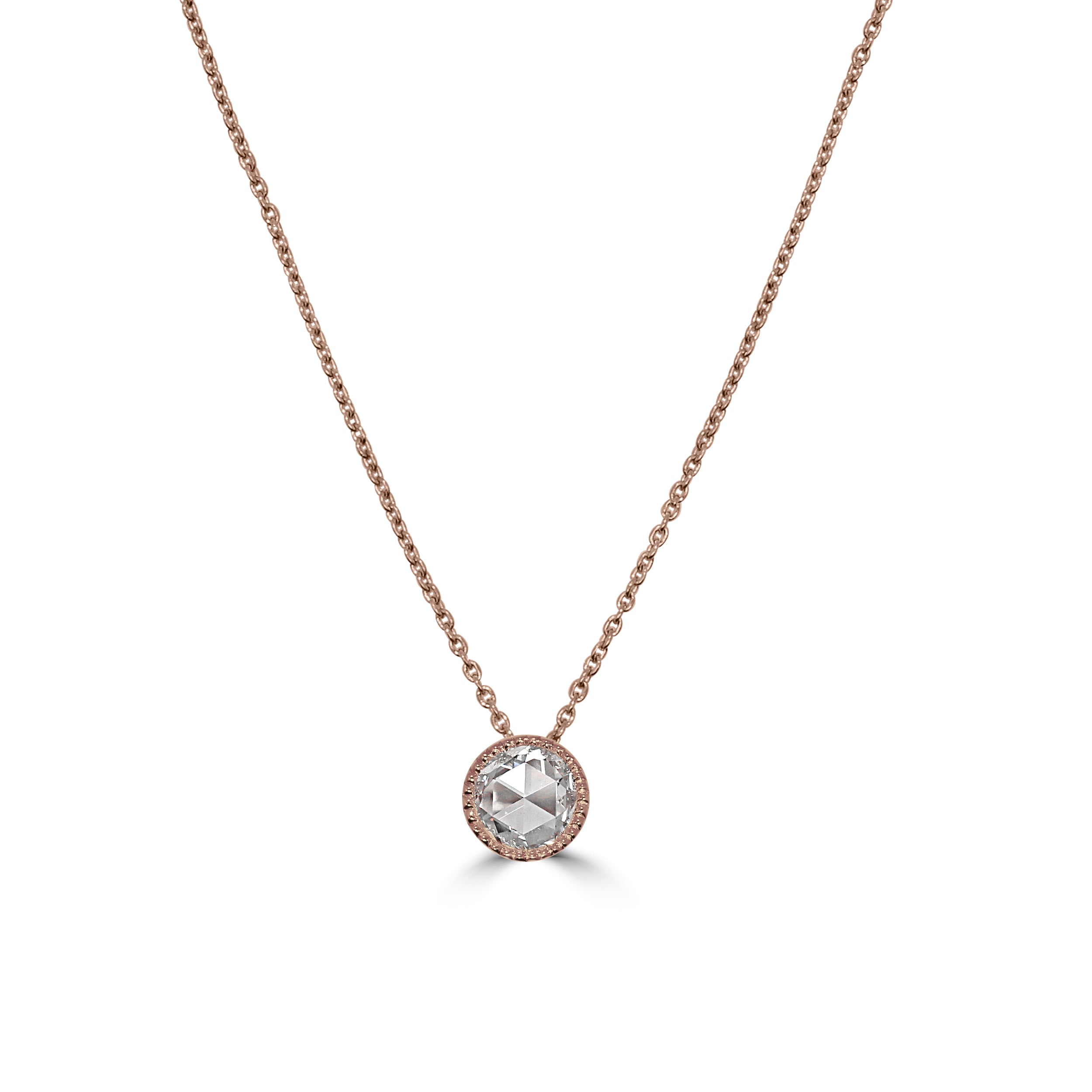 This exquisite rose cut diamond pendant necklace will enhance your daily elegance. This classic item, made of warm rose gold, showcases a brilliant rose cut diamond in a sleek bezel setting, providing a sophisticated yet modern appearance. The chain is fine and goes well with the pendant’s minimalist look, so it can be worn alone as a subtle luxury statement or layered with other pieces. This necklace provides a bit of sparkle to any ensemble, whether for everyday use or a special event. An essential item for jewelry lovers, it serves as an ideal present for a special someone. This magnificent diamond pendant allows you to experience beauty in its most refined form.