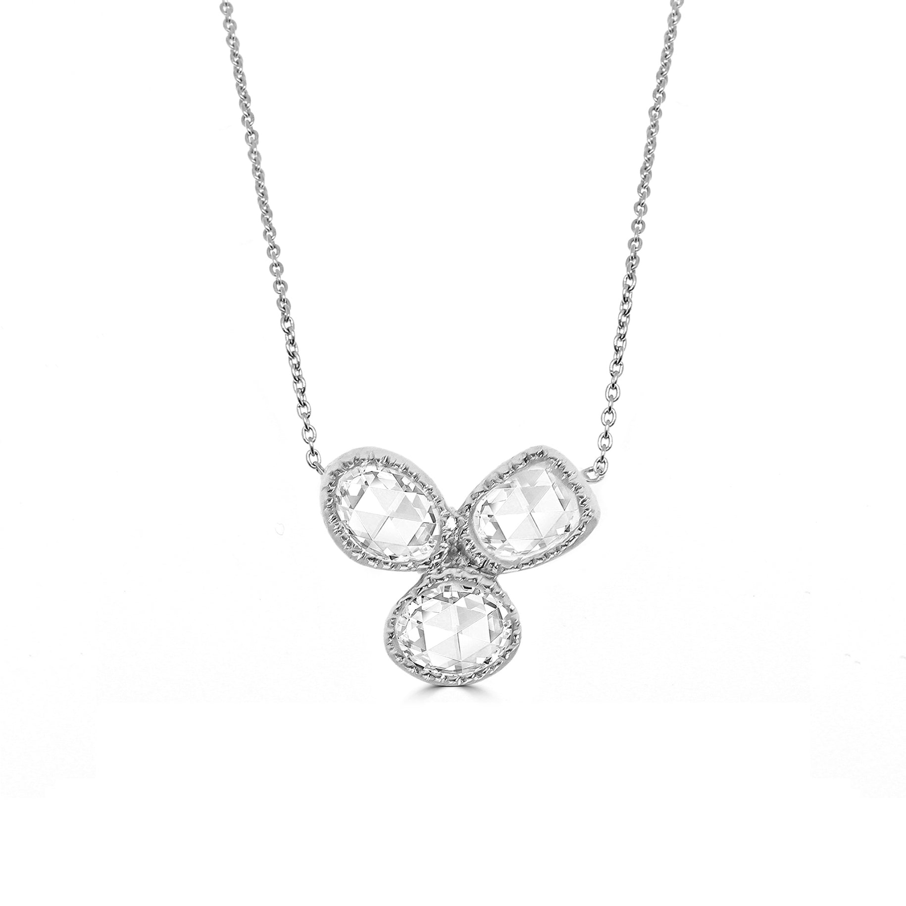 Delicate and refined, this three-petal flower MAYA necklace captures the essence of timeless elegance. Each petal is set with a shimmering rose-cut diamond, encased in a sleek bezel of 18K white gold that enhances its soft, vintage sparkle. Intricate milgrain detailing traces the edges, adding a touch of old-world charm and fine craftsmanship. Suspended from a graceful chain, this floral pendant is a subtle yet stunning statement—perfect for adding a hint of romance to any look.