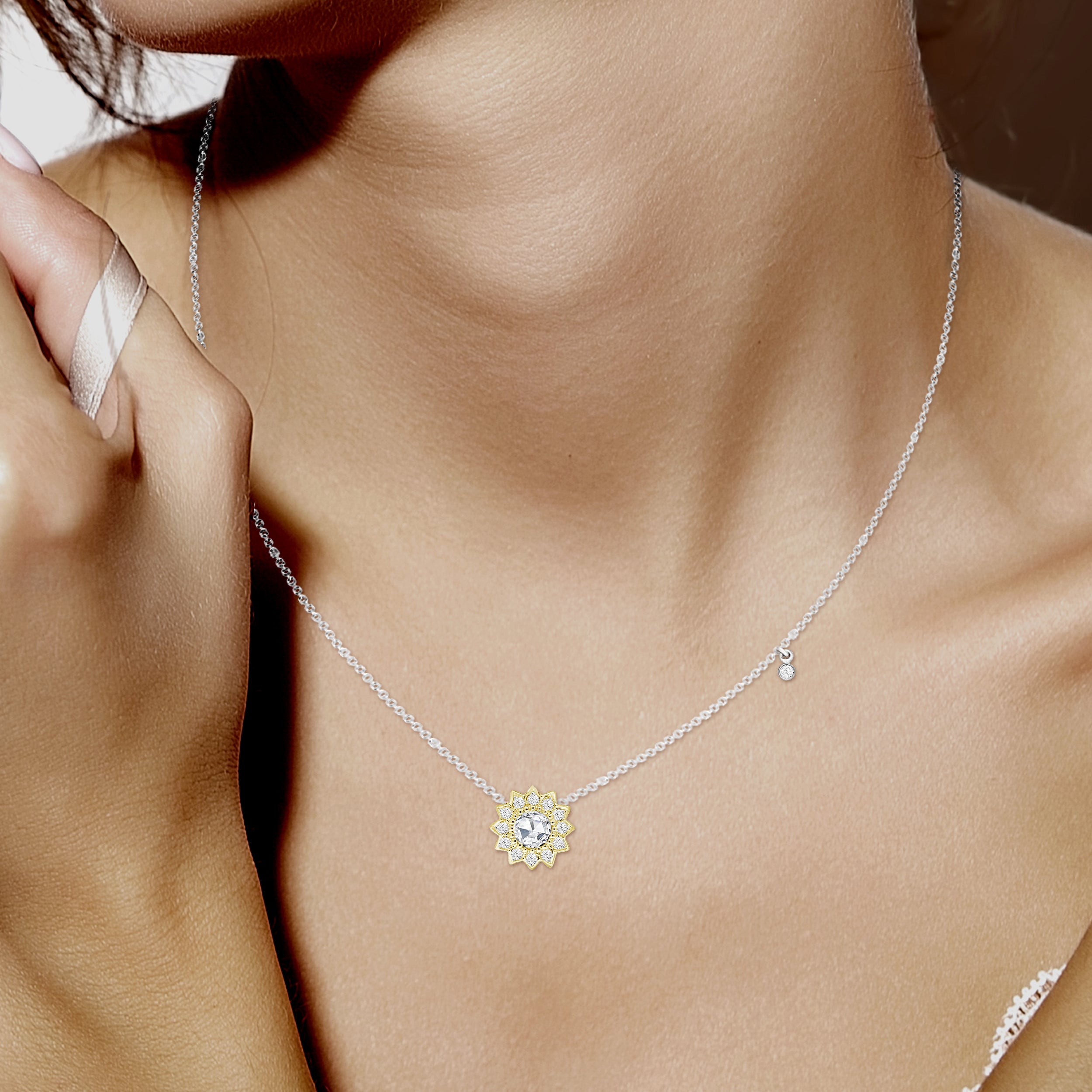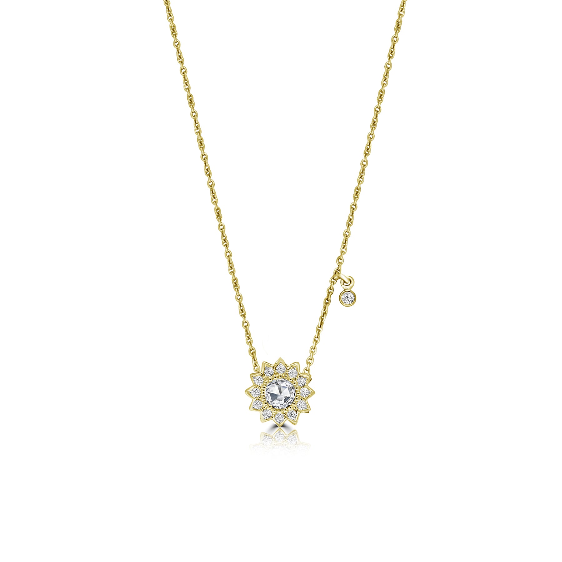 This exquisite sun inspired charm necklace is crafted in radiant 18K yellow gold, featuring a dazzling rose-cut diamond at its center. Surrounding the central gem is a halo of brilliant round diamonds, meticulously arranged to mimic the flames of sun, adding a touch of elegance and sparkle. The fine gold chain is adorned with a petite diamond charm, enhancing its uniqueness and sophistication. Perfect for everyday wear or special occasions, this necklace is a timeless piece that embodies beauty, grace, and charm. A symbol of warmth and positivity, it makes an ideal gift for yourself or a loved one.