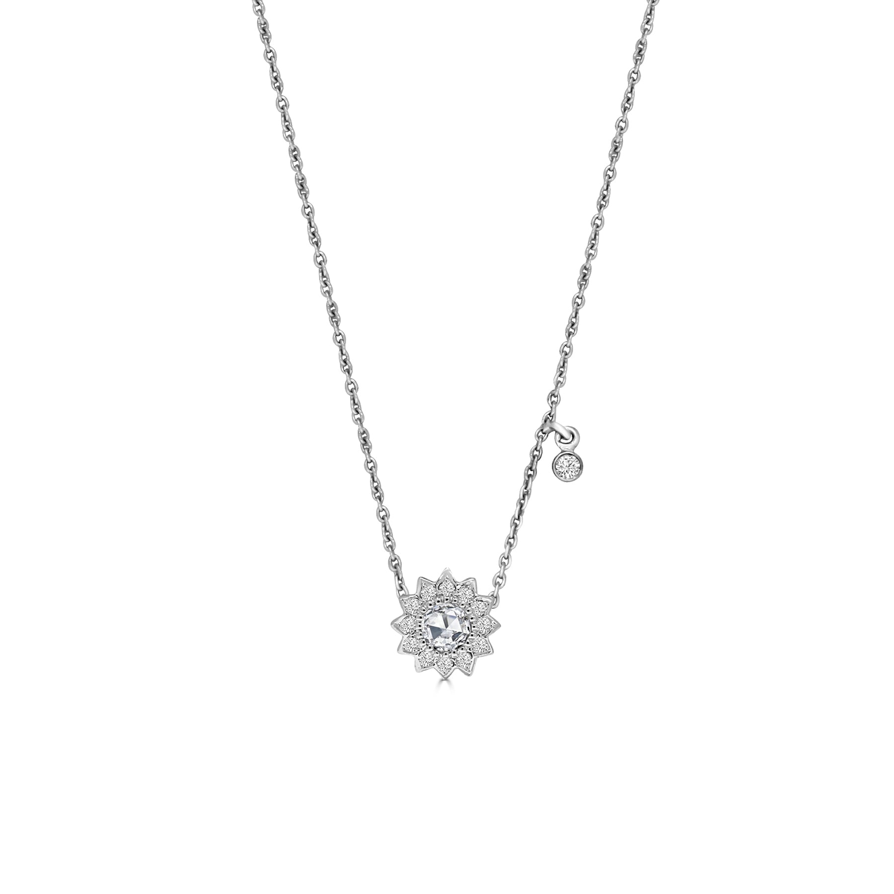 This stunning necklace, featuring a diamond pendant, showcases a radiant sunburst design made of gleaming white gold. A brilliant rose cut diamond is at the center, surrounded by a halo of smaller diamonds that creates a dazzling, shimmering effect. The elaborate arrangement resembling petals adds to its sophistication, rendering it a classic item. The necklace, hung from a fine chain, features a delightful diamond accent set in a bezel for an extra touch of elegance. This elegant accessory represents brilliance and grace, making it ideal for special occasions or an everyday touch of luxury. This piece is a remarkable enhancement to any jewelry collection and serves as a significant gift for someone dear to you or a valued memento for your own use.