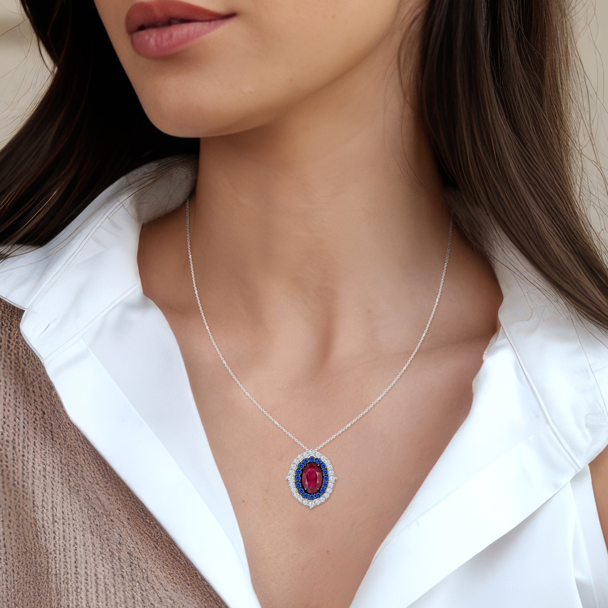 The Indigo R Ruby Diamond Necklace is a striking blend of vibrant hues and timeless sophistication. At its center, a radiant ruby exudes passion and brilliance, symbolizing enduring beauty. Encircled by a vivid halo of blue sapphires and shimmering brilliant-cut diamonds, this design creates a captivating interplay of color and sparkle.