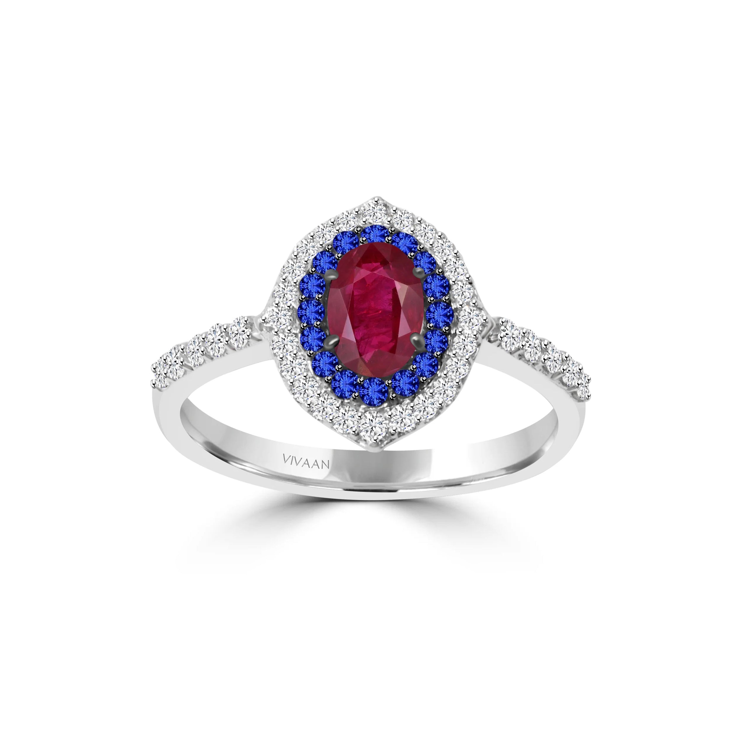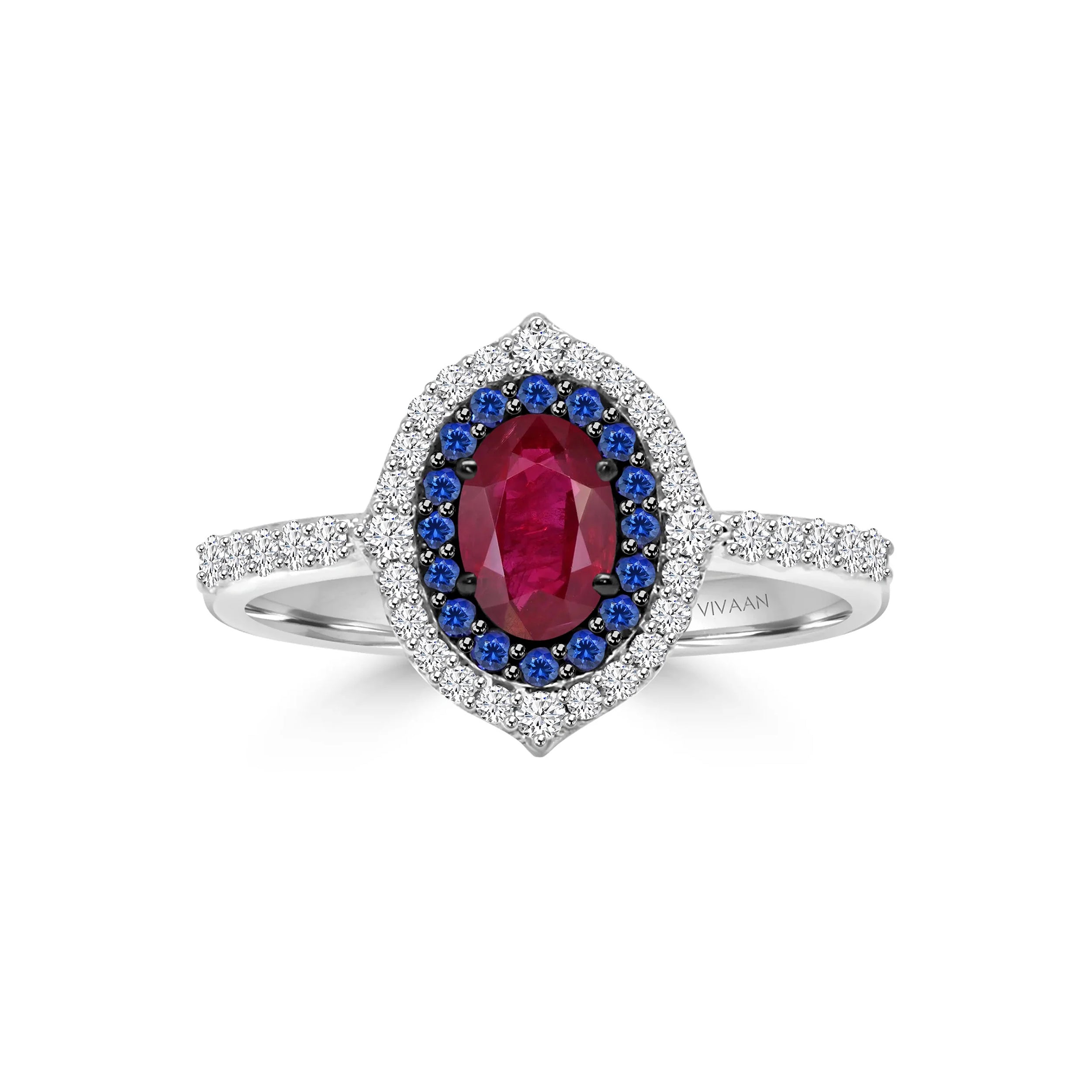 The INDIGO R Ruby and Diamond Ring is a striking expression of elegance and vibrancy. At its center, an enchanting oval ruby captivates with its deep, passionate hue. Encircled by a radiant halo of blue sapphires and sparkling brilliant-cut diamonds, this design creates a stunning interplay of color and light.