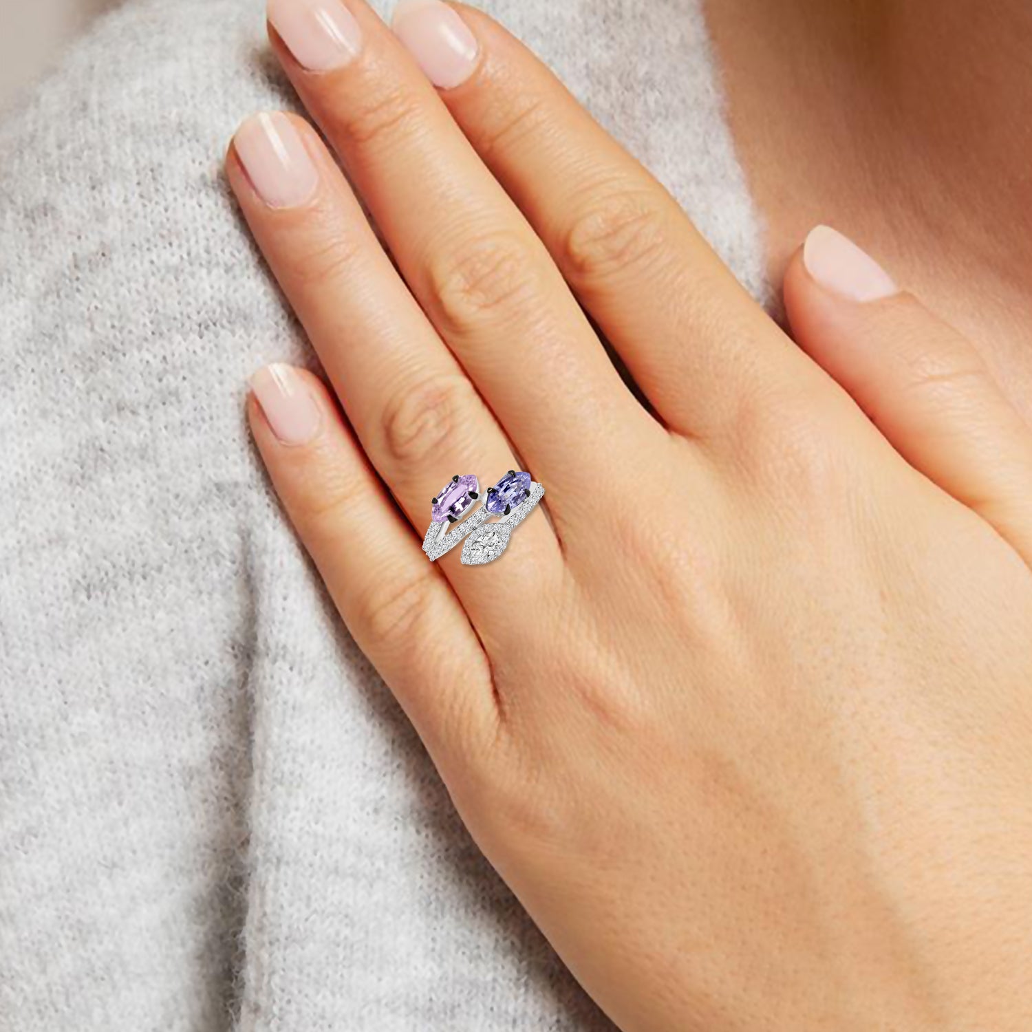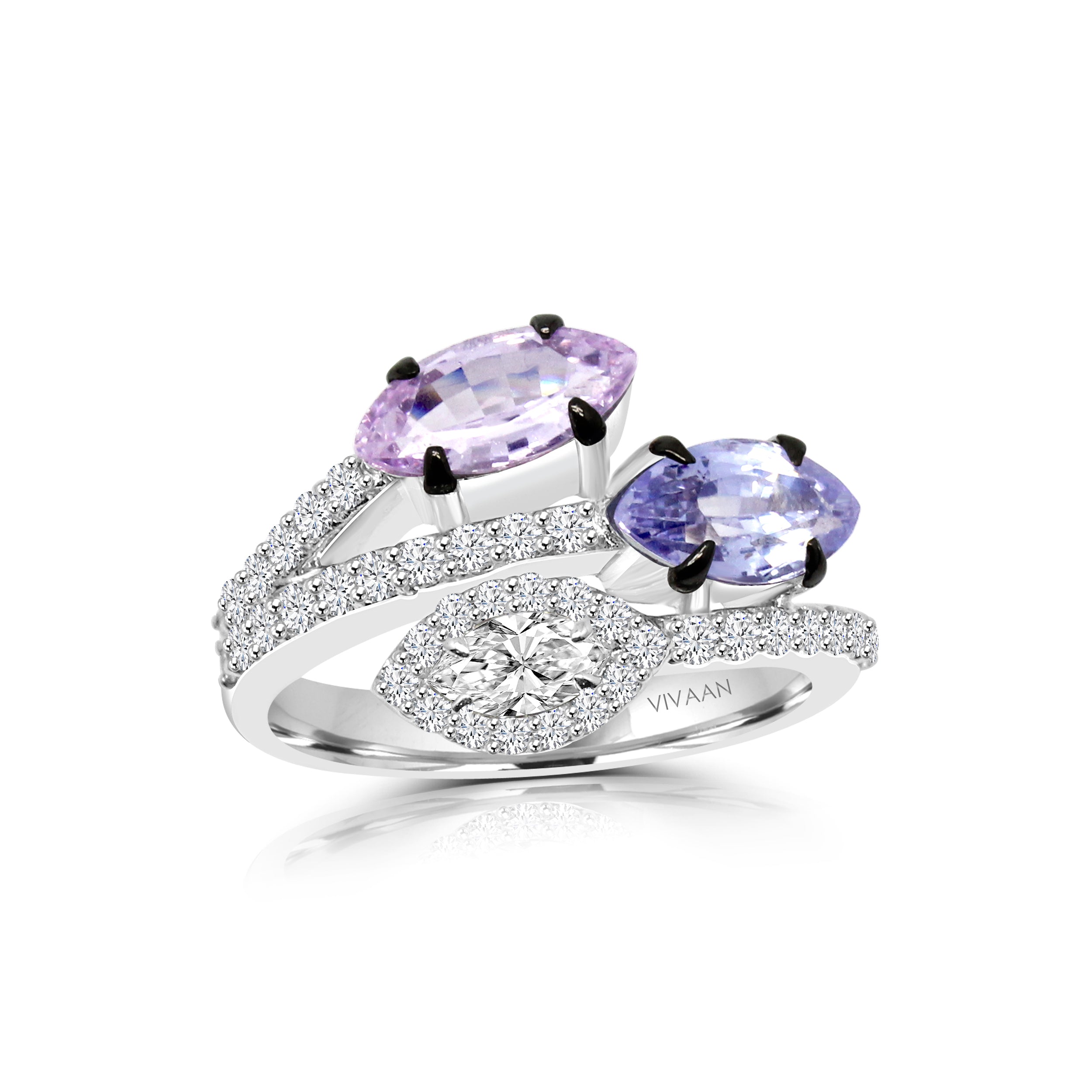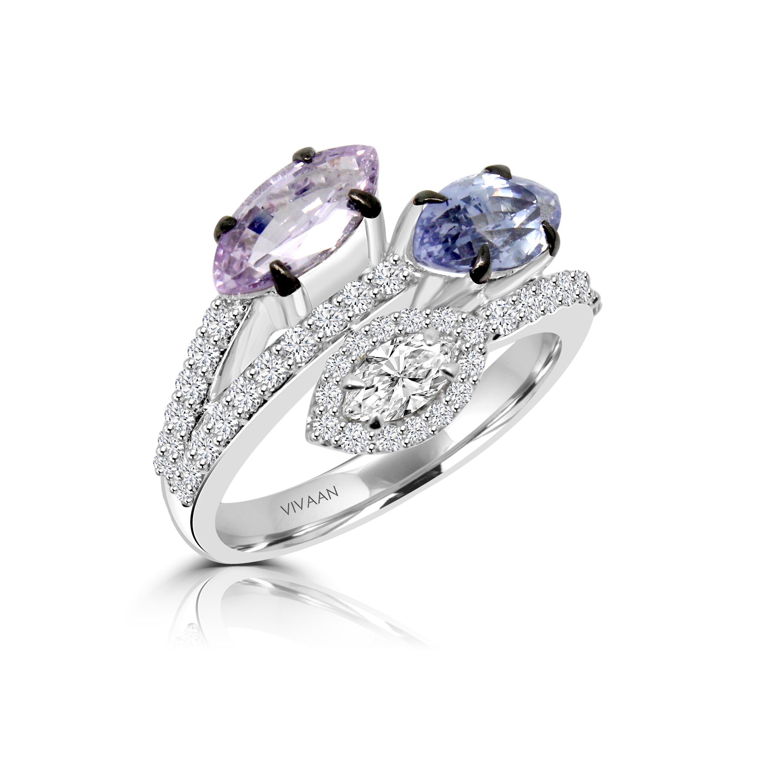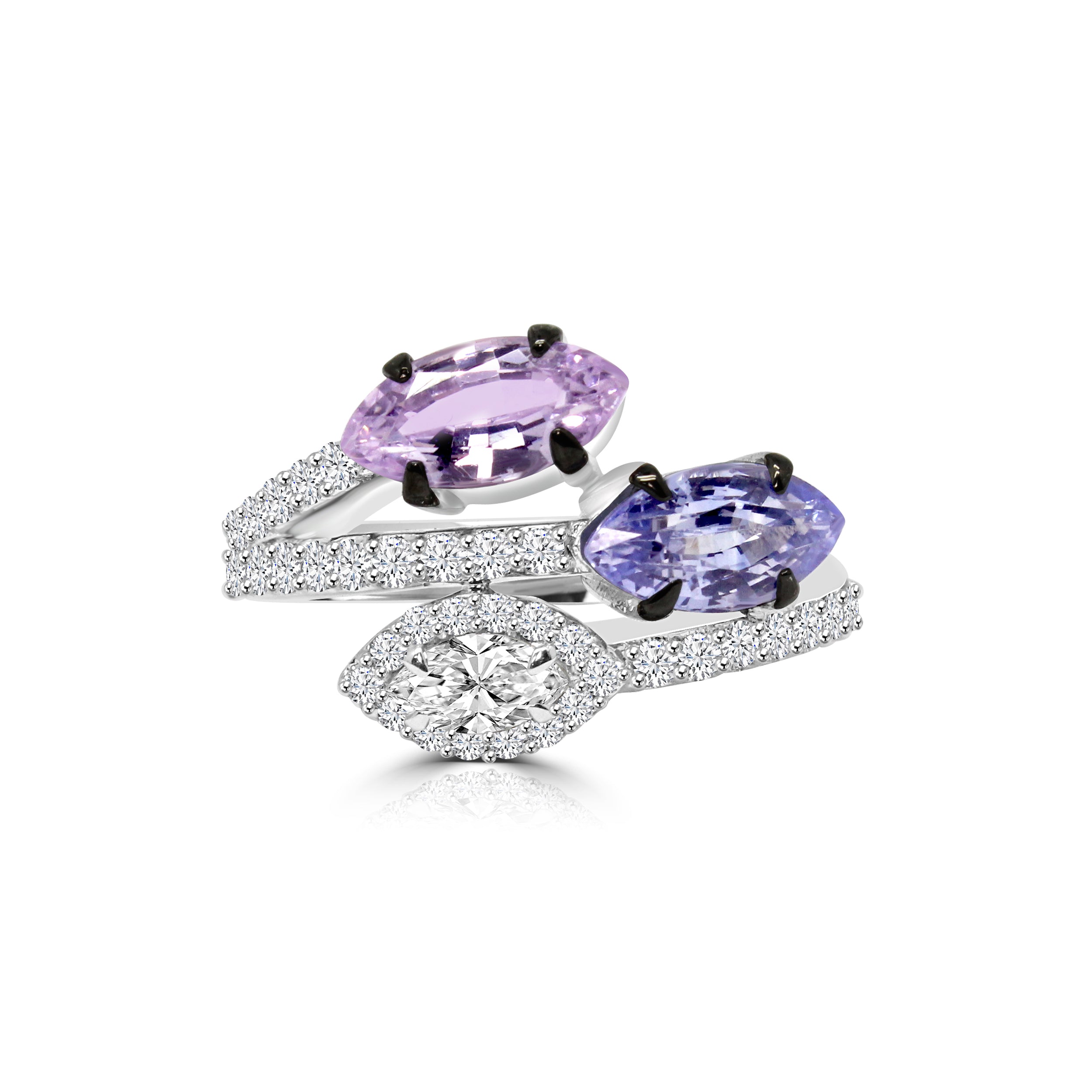 This stunning ring features a unique combination of purplish pink and blue sapphire marquise-cut gemstones with colorless marquise diamond, elegantly set in a captivating design. The purplish pink and blue hues of the sapphires are perfectly complemented by the sparkling brilliance of the white diamonds, which accent the piece with their own enchanting radiance. The intricate, distinctive shape of the marquise-cut stones lends a regal and sophisticated appeal to the ring, making it a perfect statement piece for any occasion. The combination of colors and angular shapes shows off the perfect mixture of modern and classic style, making it a timeless addition to any jewelry collection. Made with high-quality materials, this ring is sure to dazzle for years to come.