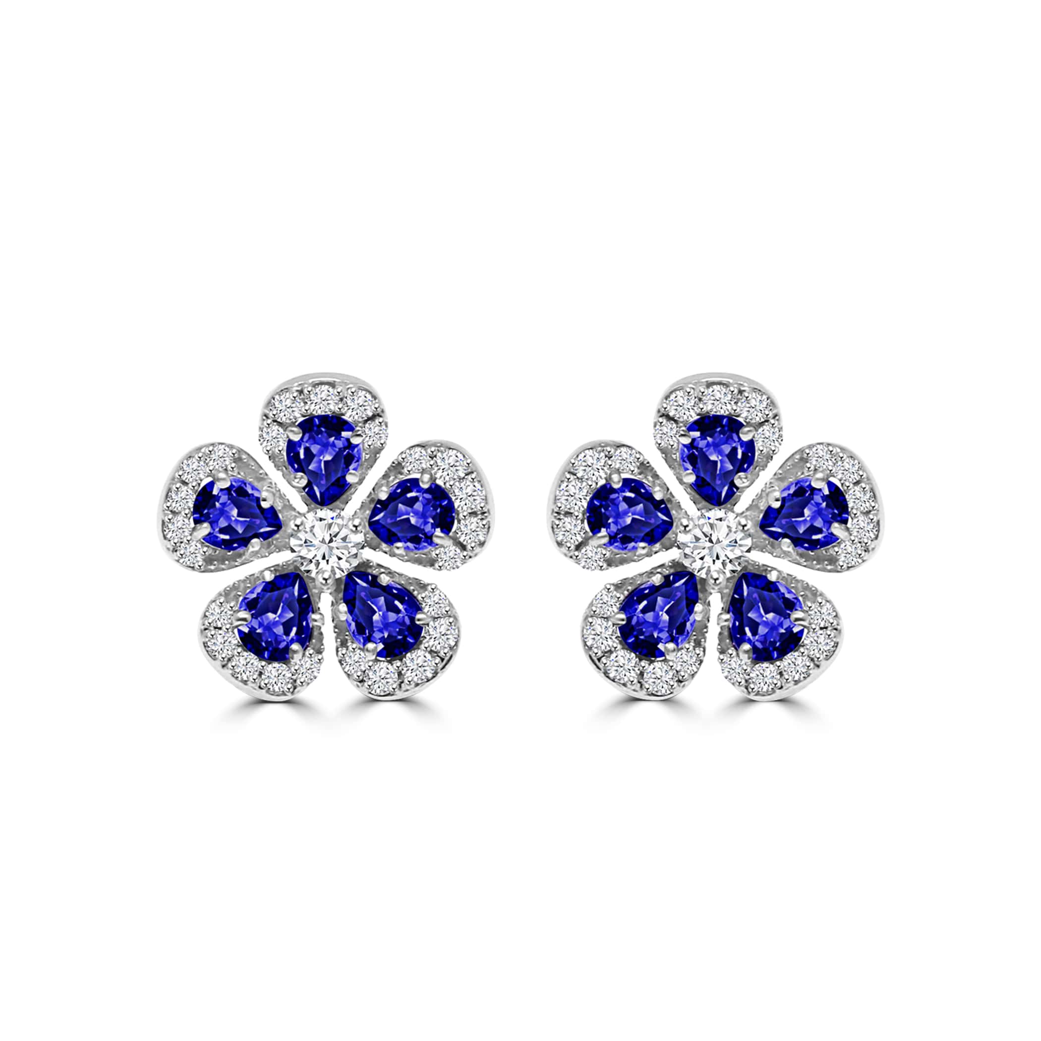 Enhance your elegance with these stunning floral CHAMOMILE stud earrings, carefully made from gleaming white gold. Five pear-cut sapphires of a deep blue hue are arranged in a delicate floral design on each earring, symbolizing sophistication and grace. A halo of dazzling brilliant-cut diamonds encircles the sapphires, adding brilliance and enhancing the floral motif. At the heart of the work of art lies a brilliant diamond, which lays upon it an air of luxury and timelessness. These earrings, which are a beautiful fusion of modern luxurious style and timeless allure, are ideal for everyday use as well as for events of significance. An essential item for anyone who loves jewelry and is after sophistication and refined beauty.