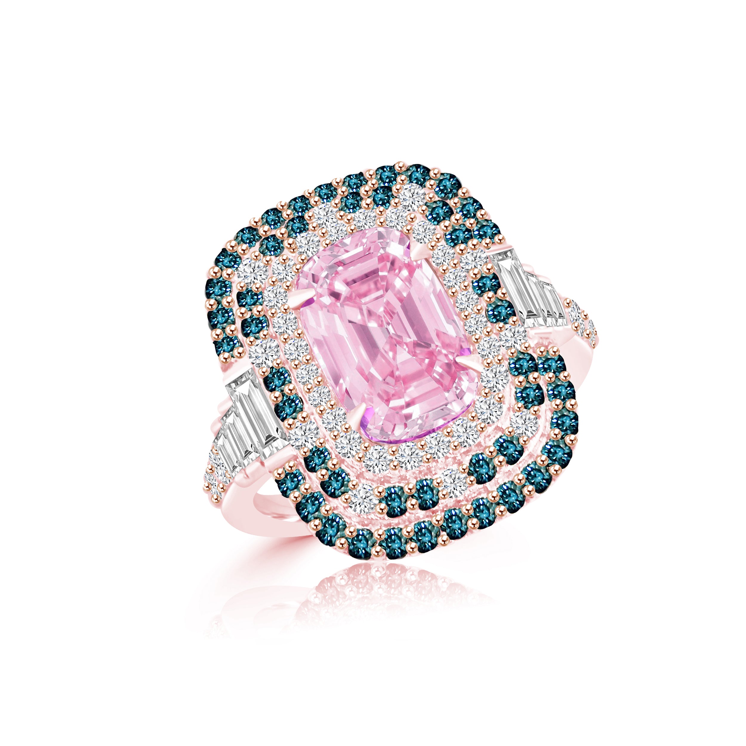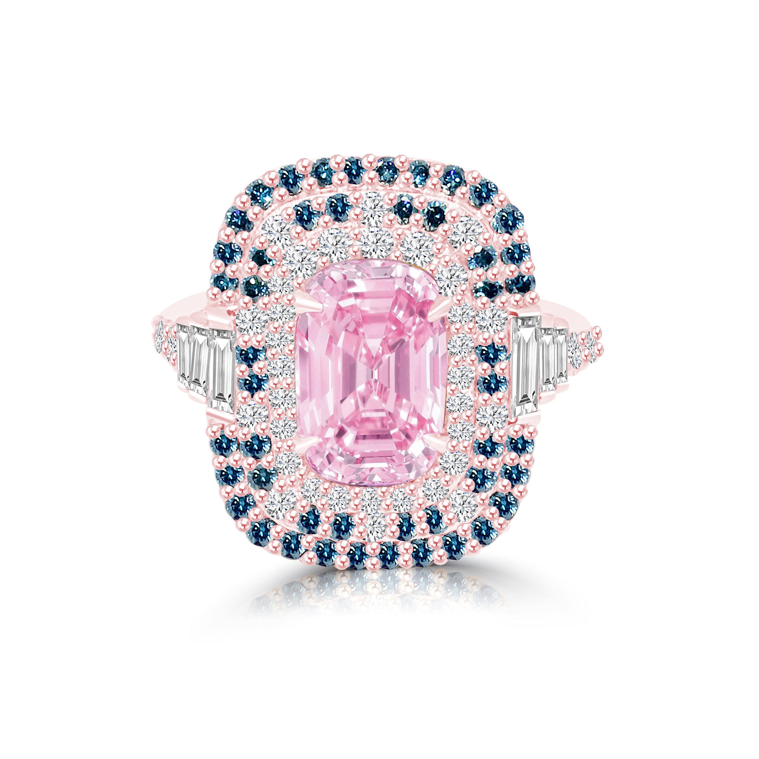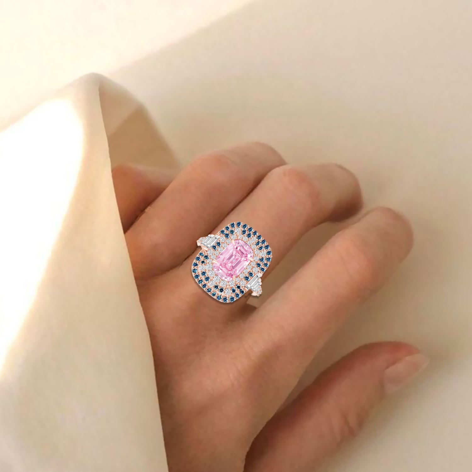 Our SARUS ring is a work of art, crafted with luxurious rose gold and adorned with gentle baby pink tourmaline. Admired from every angle, it is encircled with a dazzling array of brilliant and blue diamonds and diamond baguettes, adding a layer of exquisite dimension. Perfect for special occasions and a sight to behold, it will be treasured for a lifetime.
