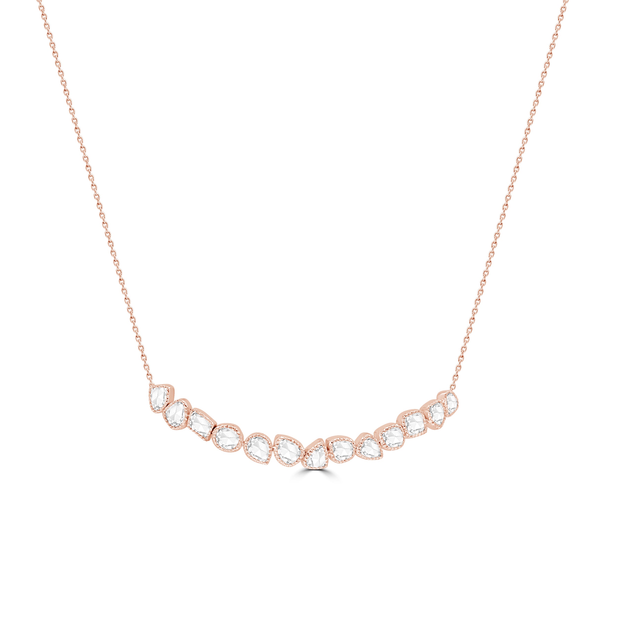 Delicately romantic and timeless, this SATA necklace features twelve mixed-shape rose-cut diamonds, each radiating a gentle, ethereal sparkle. Set in warm 18K rose gold, every diamond is framed with fine milgrain detailing, lending a vintage-inspired elegance and refined craftsmanship to the design. Gracefully arranged along a slender chain, this piece captures the essence of soft femininity and enduring charm—perfect for adding a touch of graceful sophistication to any look.