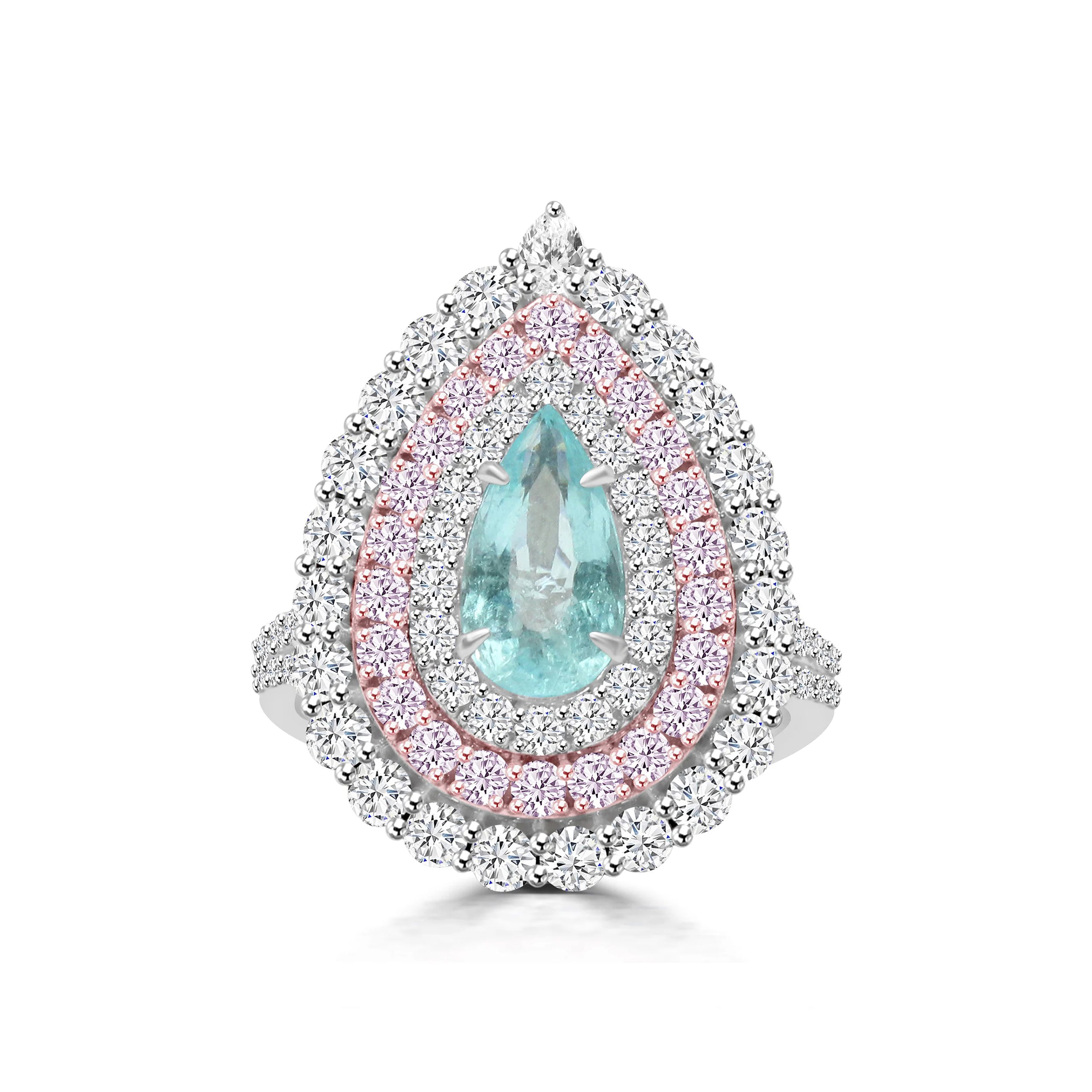 A Symphony of Color and Light, The SAVARA - Paraiba Tourmaline Ring is a breathtaking expression of refined luxury, centered around an exquisite pear-shaped Paraiba tourmaline. This rare gemstone radiates with its signature vibrant blue-green hue, captivating the eye with its luminous intensity. Encircling the Paraiba are a delicate array of natural pink and brilliant diamonds, each carefully selected to enhance the ring’s brilliance and create a striking contrast of color and light. A true masterpiece of design and craftsmanship, the SAVARA ring is a timeless symbol of elegance and sophistication, perfect for those who appreciate the rare and extraordinary.