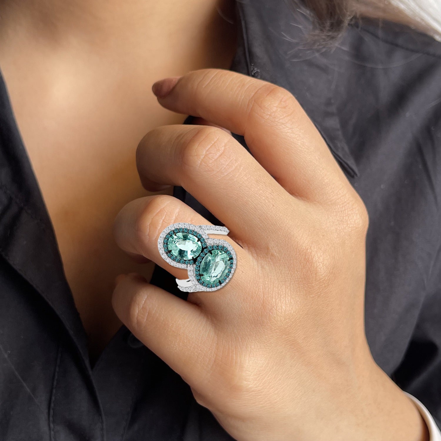 Indulge in the beauty of ARDOR with its timeless design crafted in 18k white gold. Glimmering twin emeralds are surrounded and accented by colorless and blue diamonds, creating a sparkling and captivating look that is both modern and classic. Dare to be daring.