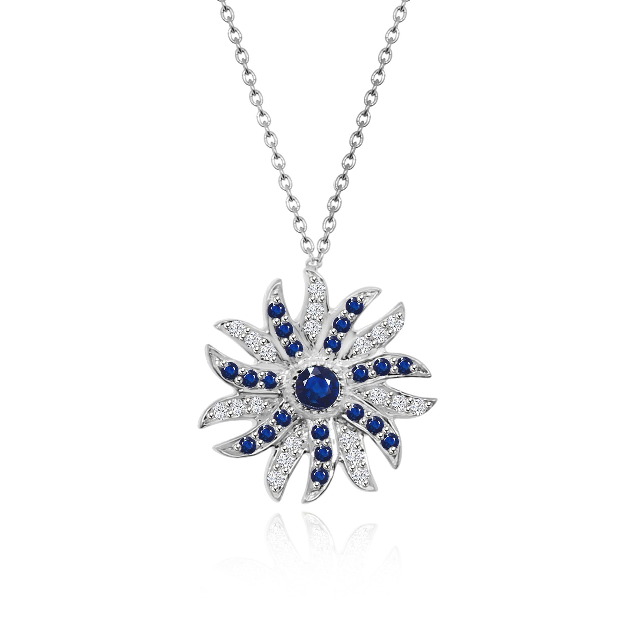 The Sunflame necklace is a striking embodiment of strength, elegance, and celestial allure. At its core lies a captivating round blue sapphire, echoing the depth of ocean tides and midnight skies. Surrounding the center, radiant flame motifs unfurl in perfect symmetry, alternately studded with brilliant-cut diamonds and vivid blue sapphires for a dazzling interplay of light and color. Set in gleaming 18K white gold, this necklace is a powerful symbol of fiery grace and luminous beauty—crafted to ignite the spirit and captivate the soul.