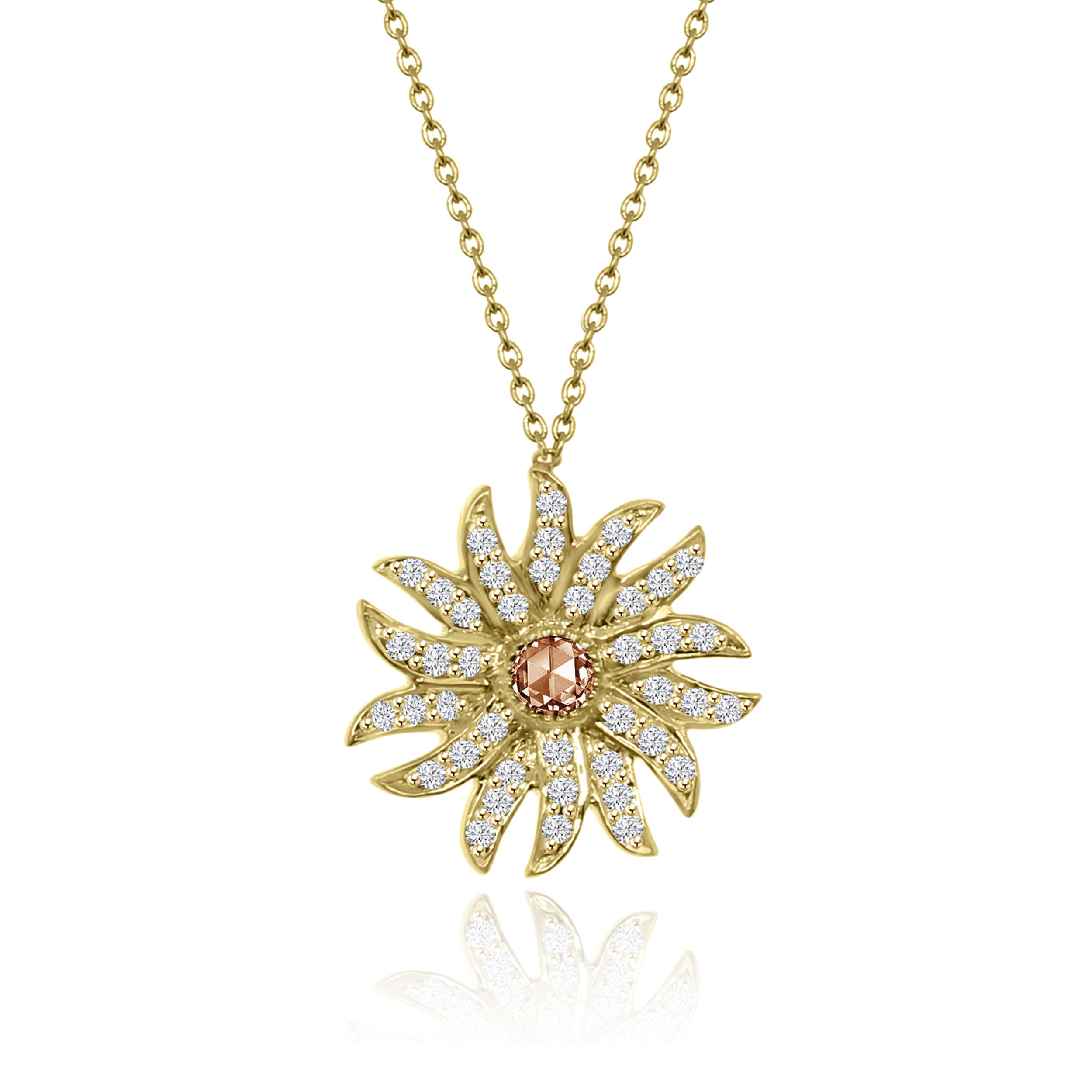 The Sunflame necklace is a radiant celebration of warmth, passion, and luminous beauty. At its heart lies a glowing champagne rose-cut diamond, capturing the soft golden hues of a setting sun. Surrounding the center stone, flame-inspired motifs unfurl in a blaze of brilliance, each meticulously set with brilliant-cut diamonds that dance with light. Crafted in opulent 18K yellow gold, this necklace embodies the fiery spirit of the sun—bold, elegant, and endlessly captivating.