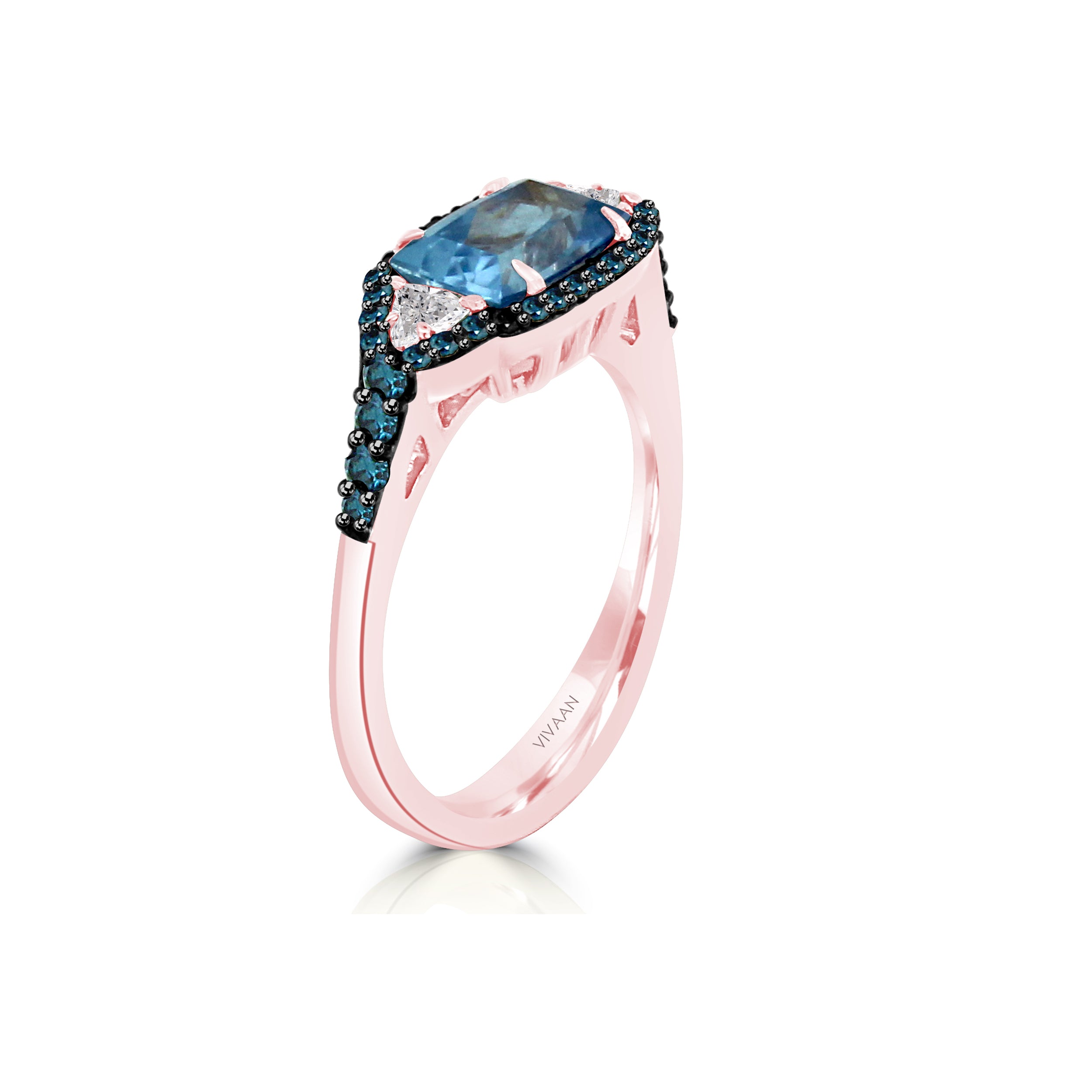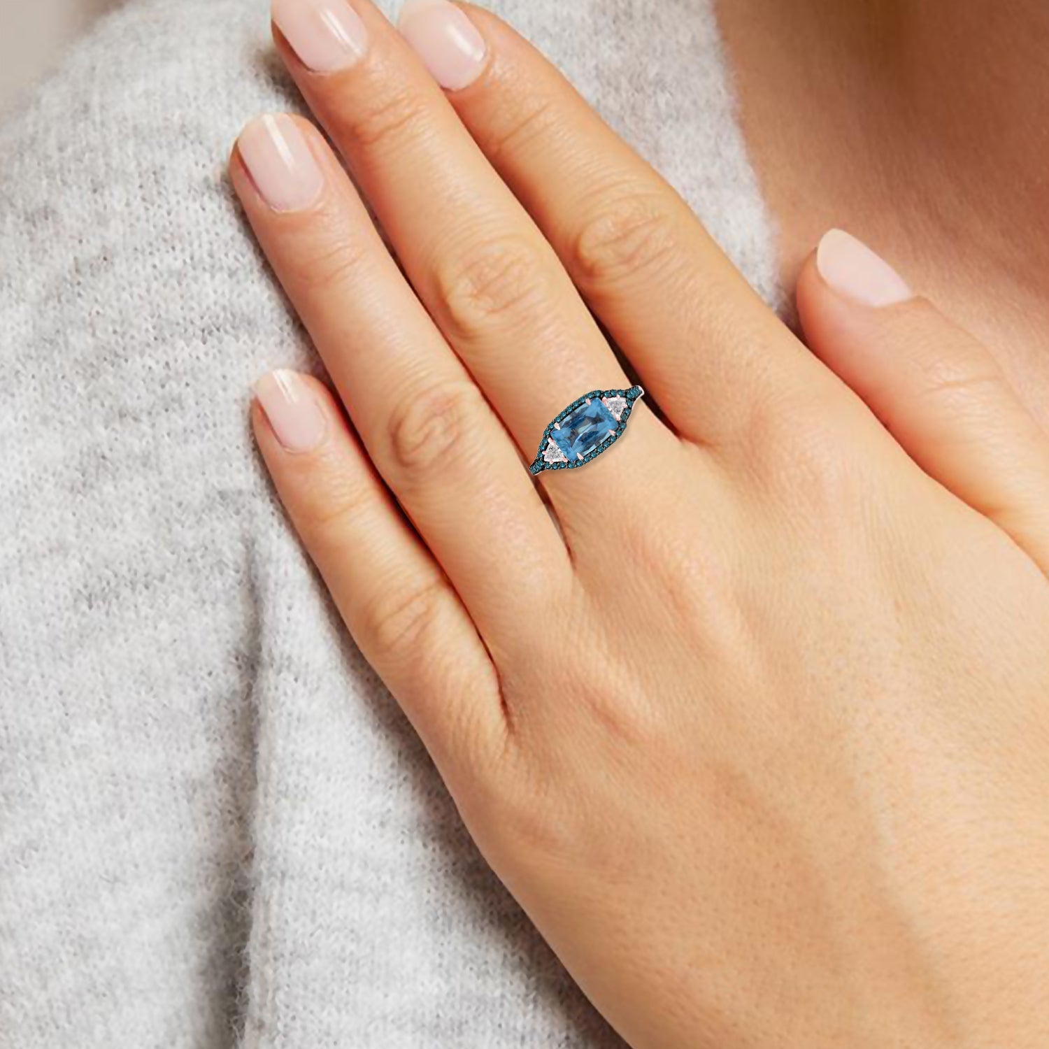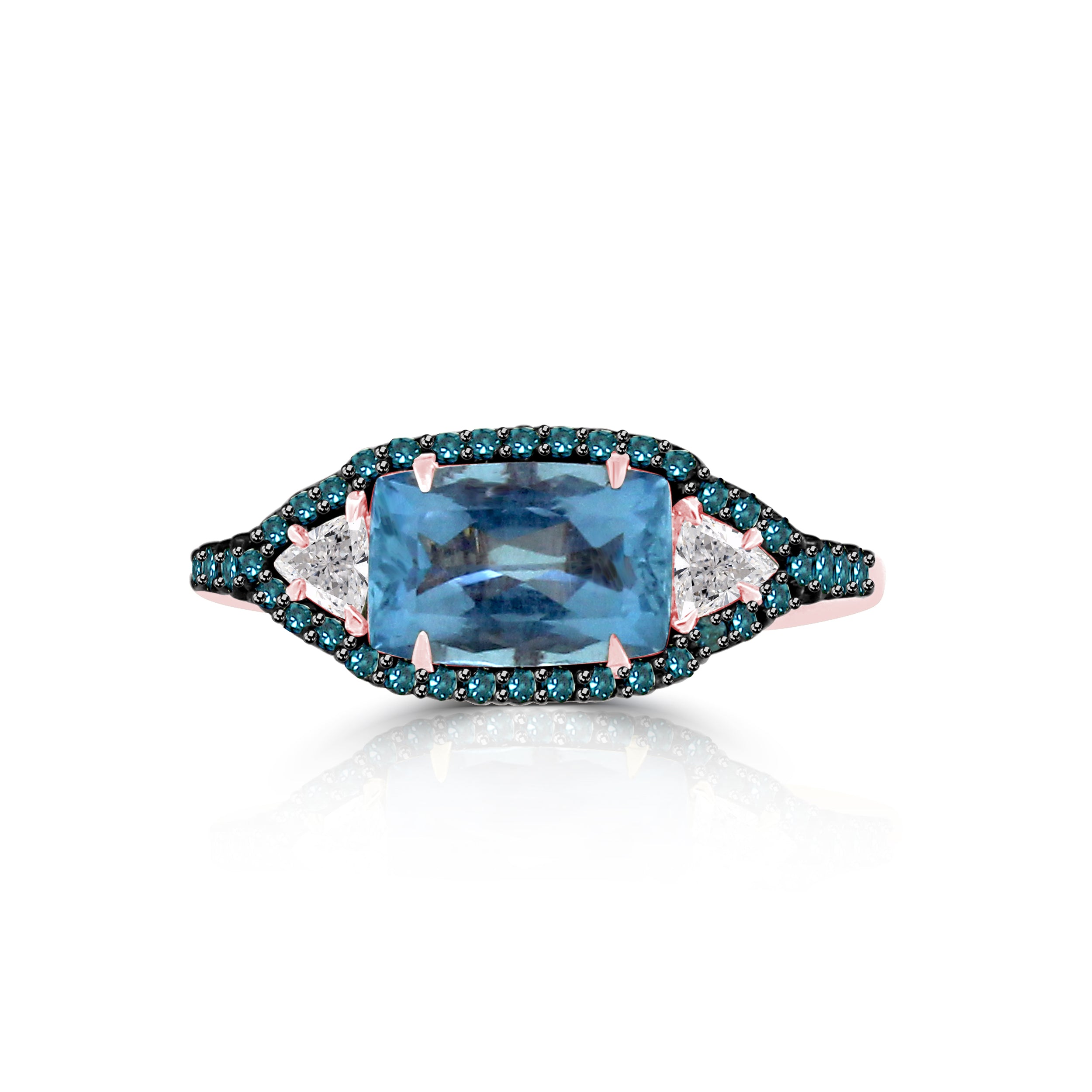 This SWISS aquamarine ring is sure to make a “splish-splash” impression. Adorned with fancy white and treated blue diamond accents, this 14K rose gold piece adds a bit of “bubbliness” to any style. Shine on!