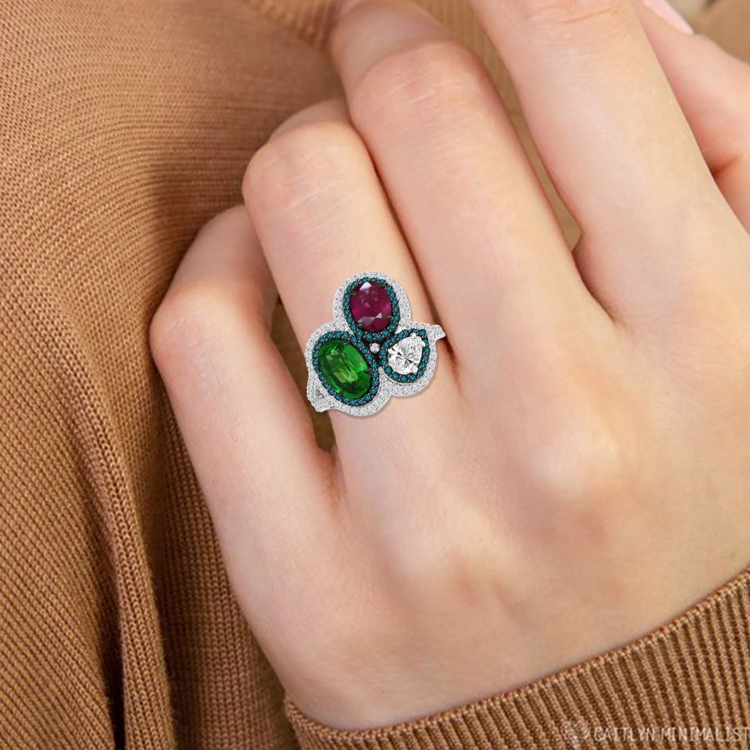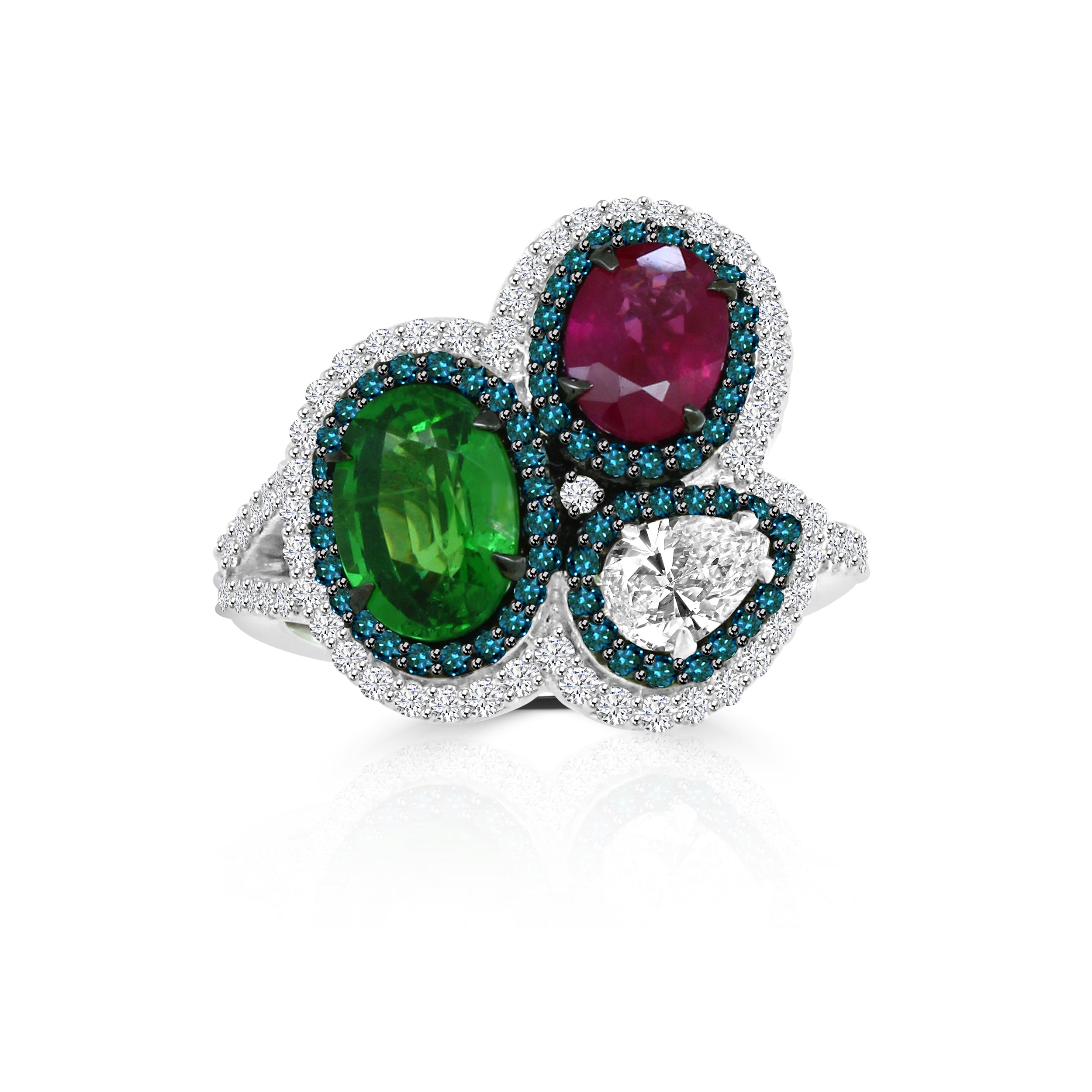 This gorgeous TAFFY ring features a stunning combination of emerald, tsavorite, ruby, and fancy diamond stones set in 18K white gold. Its central treated blue diamond adds a brilliant touch of vibrancy and elegance to this eye-catching jewelry piece.