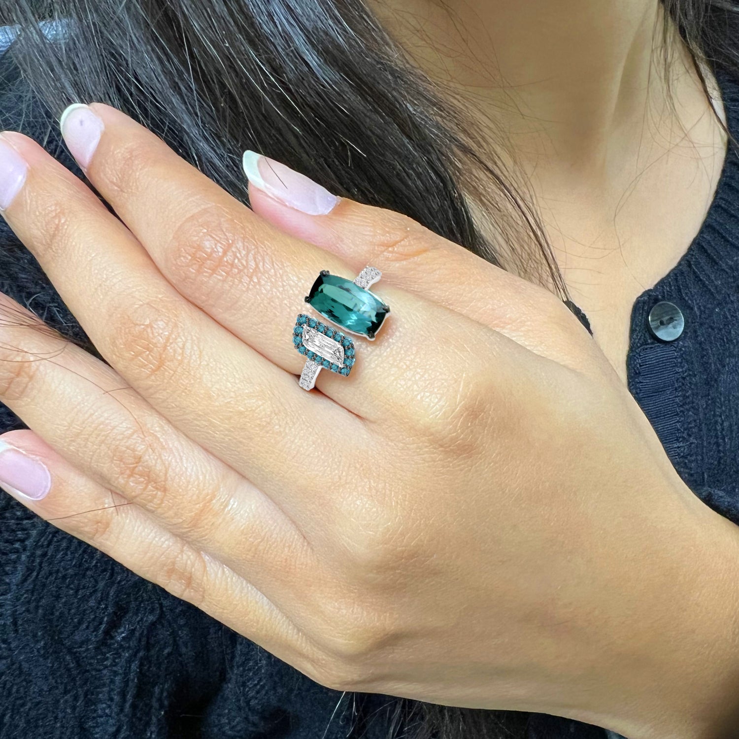 Split ring featuring mesmerizing blue tourmaline and complimented with unique fancy cut diamond surrounded with blue diamond set in 18k white gold.