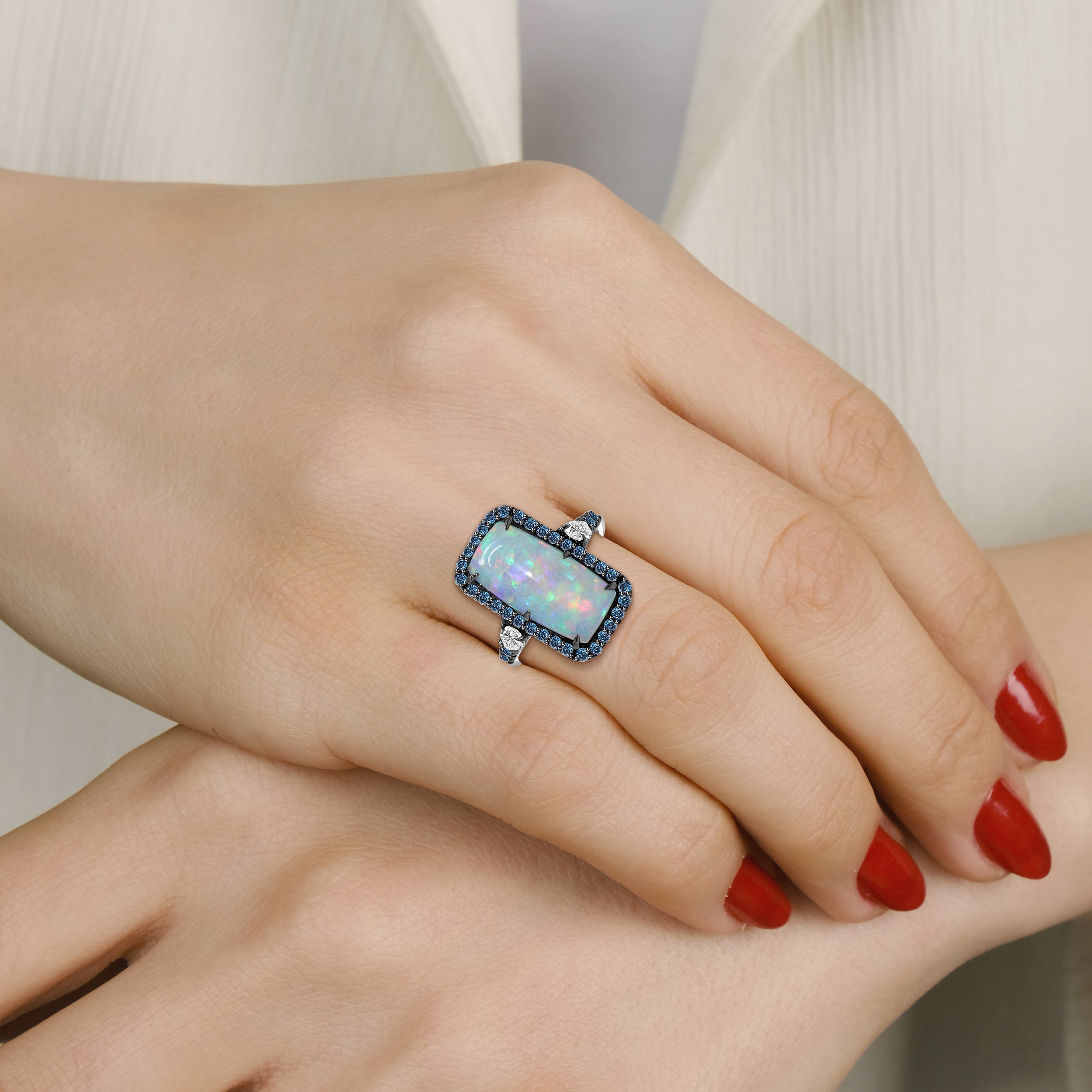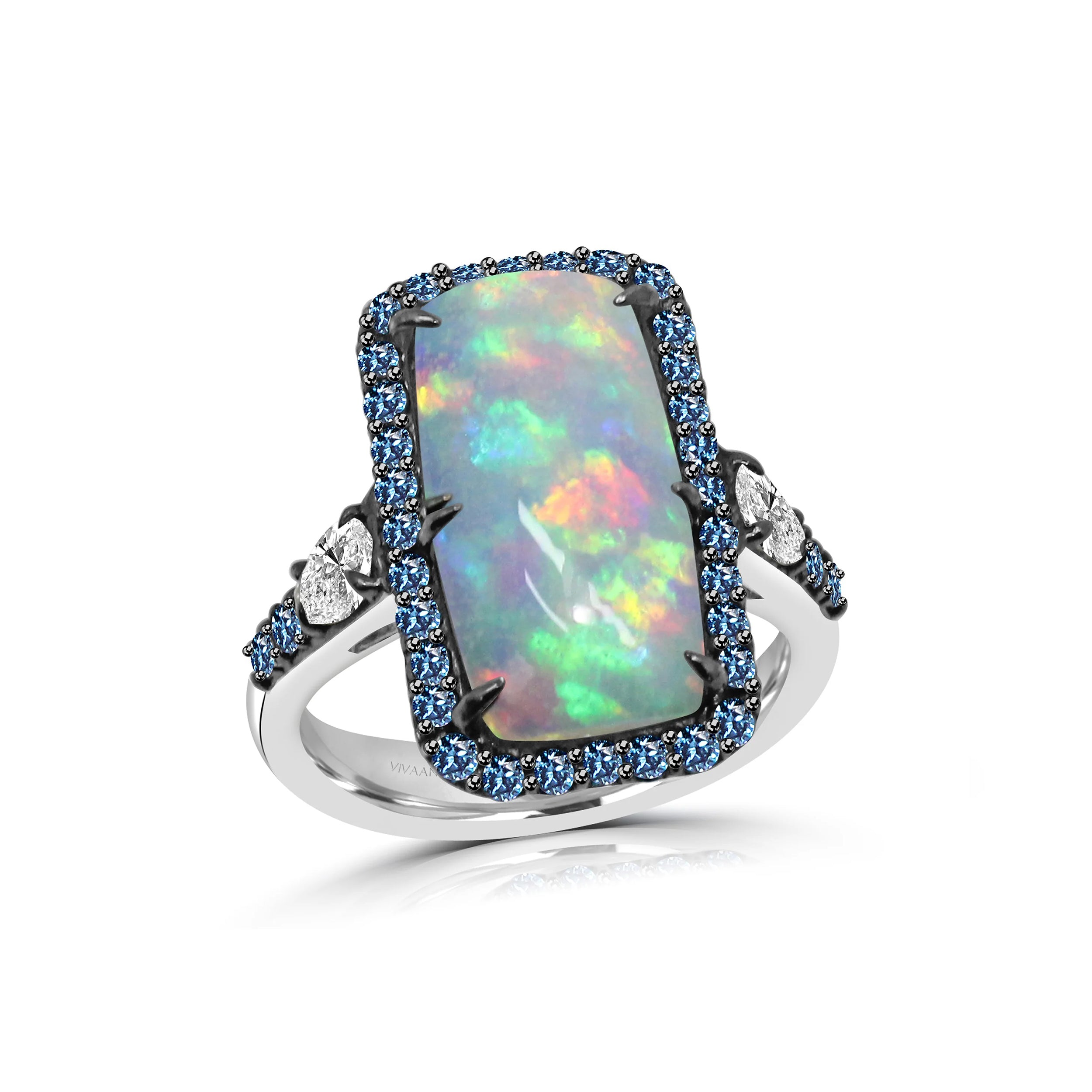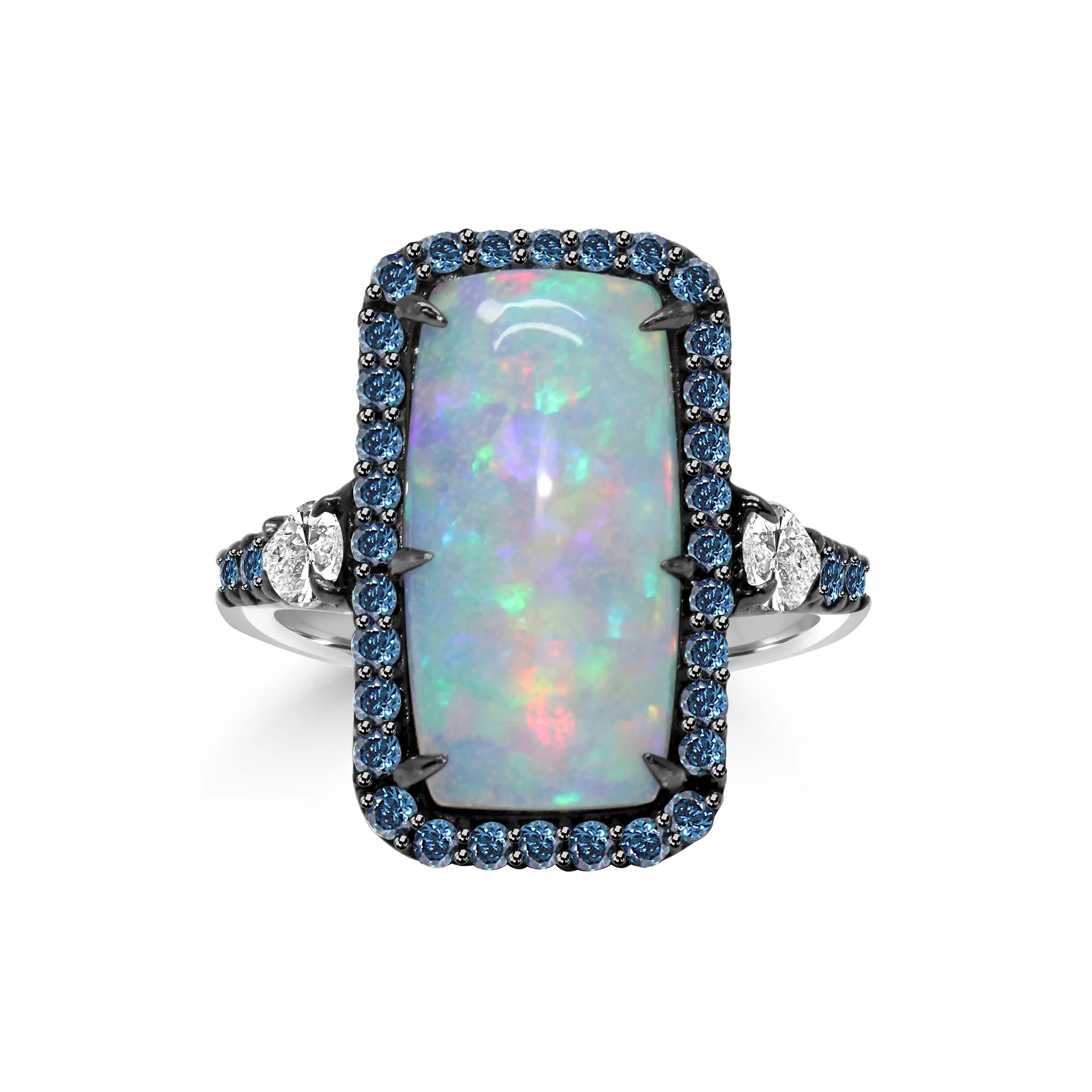 Step into the spotlight with the TYSEL - Pear Shaped Diamond Ring, where a mesmerizing long opal steals the show, flashing with its kaleidoscope of vibrant hues. Accented by brilliant blue and round diamonds, this ring brings sparkle and personality to every moment. The pear-shaped diamonds on the sides add a whimsical touch, making this piece a true standout.