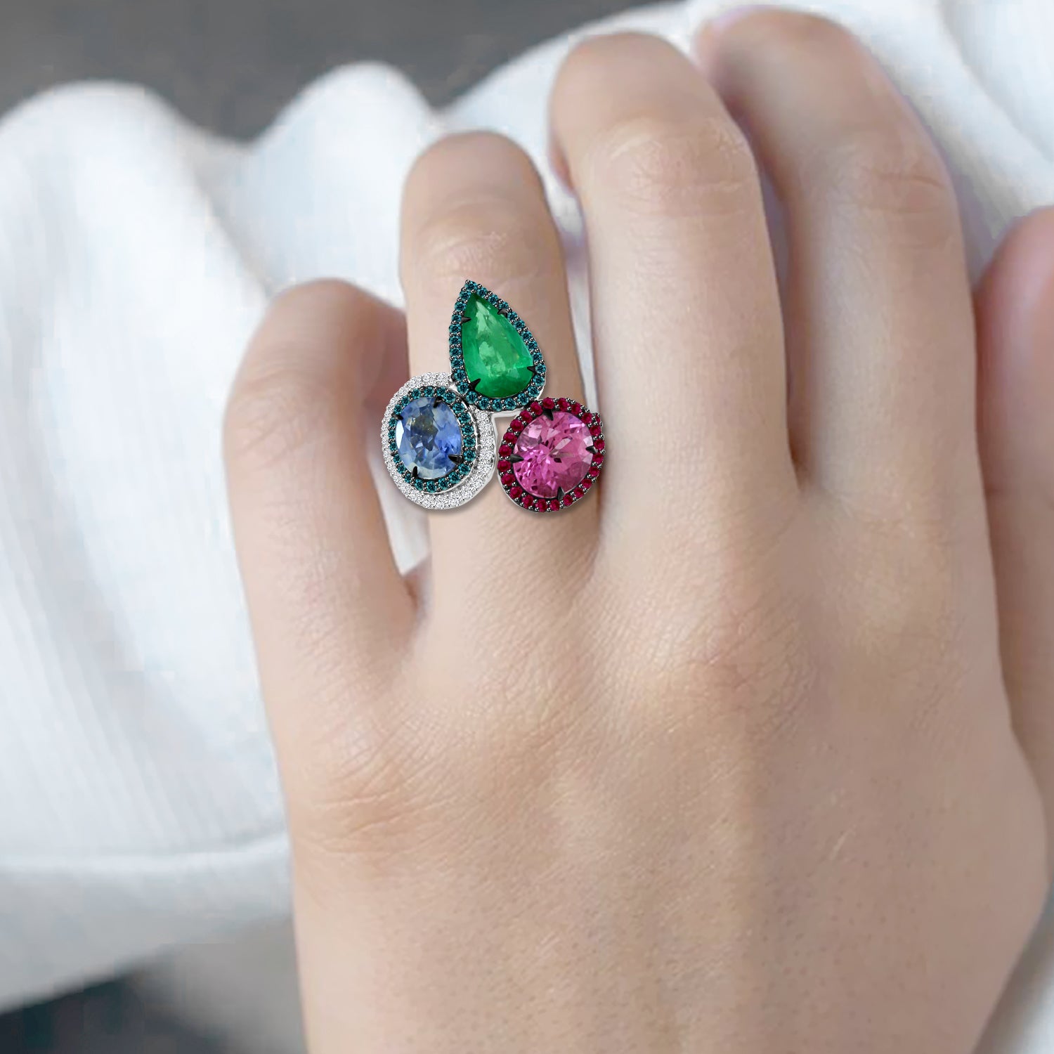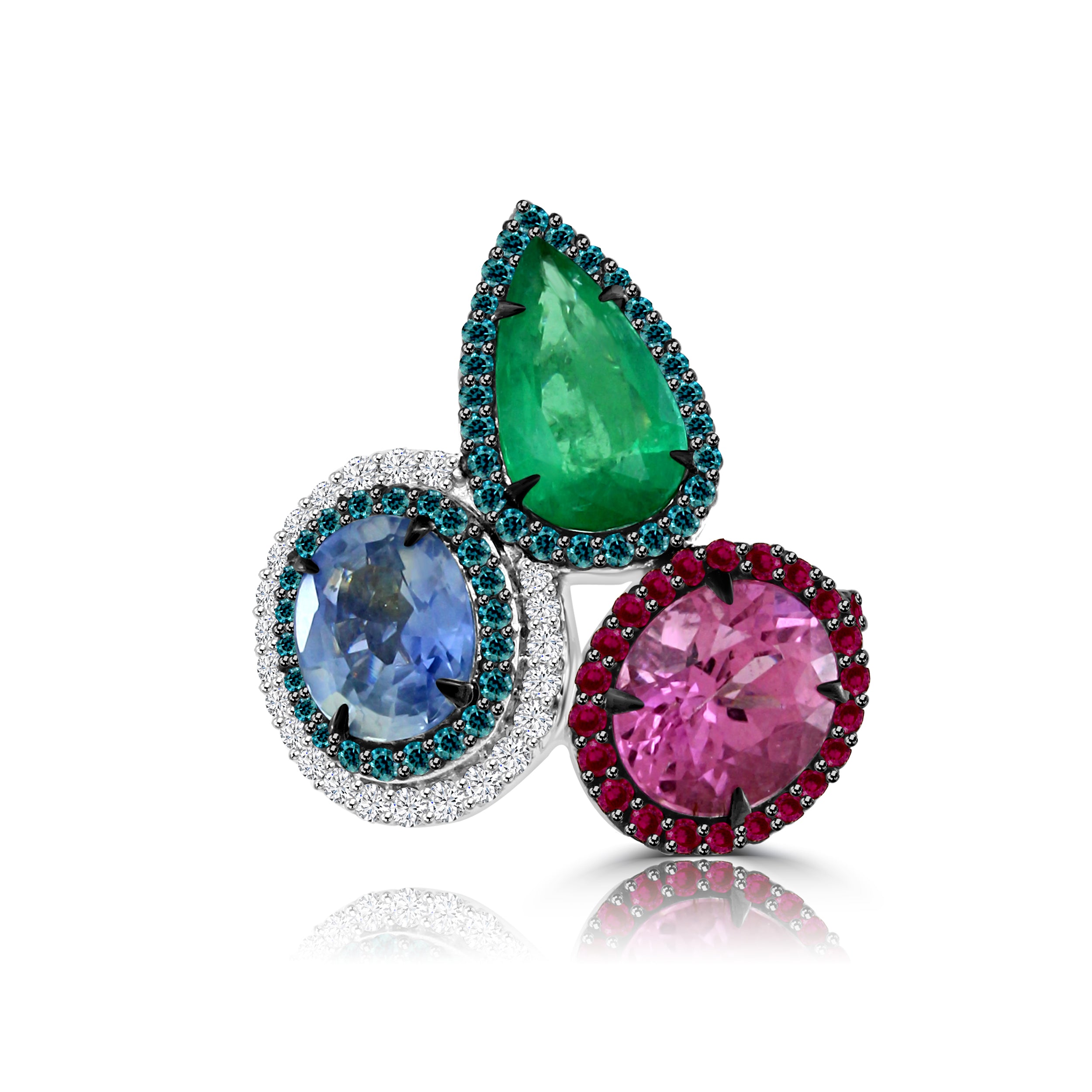 This VERDURE ring is meticulously crafted with 18K white gold, set with a stunning combination of emerald, ruby and pink sapphire stones, and the brilliantly cut blue diamond and ruby complete the piece. A truly luxurious statement piece that will shine with elegance.