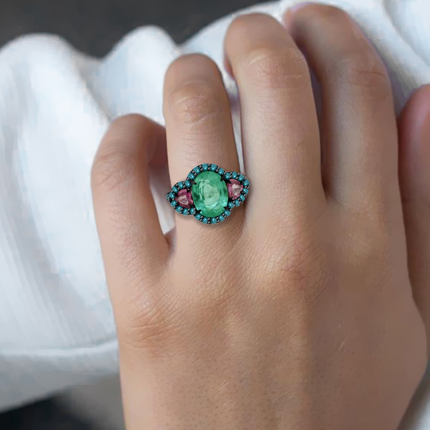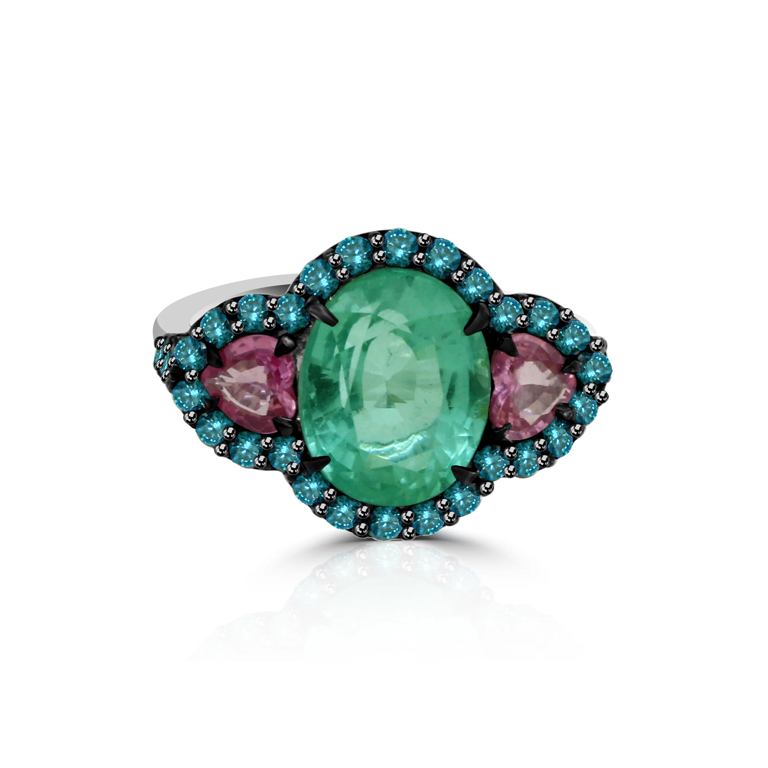Indulge in a bit of sparkle with this delightful EMERALD & PINK SAPPHIRE RING featuring blue diamonds! Crafted in lustrous 18K WHITE GOLD, this unique piece will have everyone starstruck and instantly fall in love. Embrace the eye-catching glimmer of EMBER!
