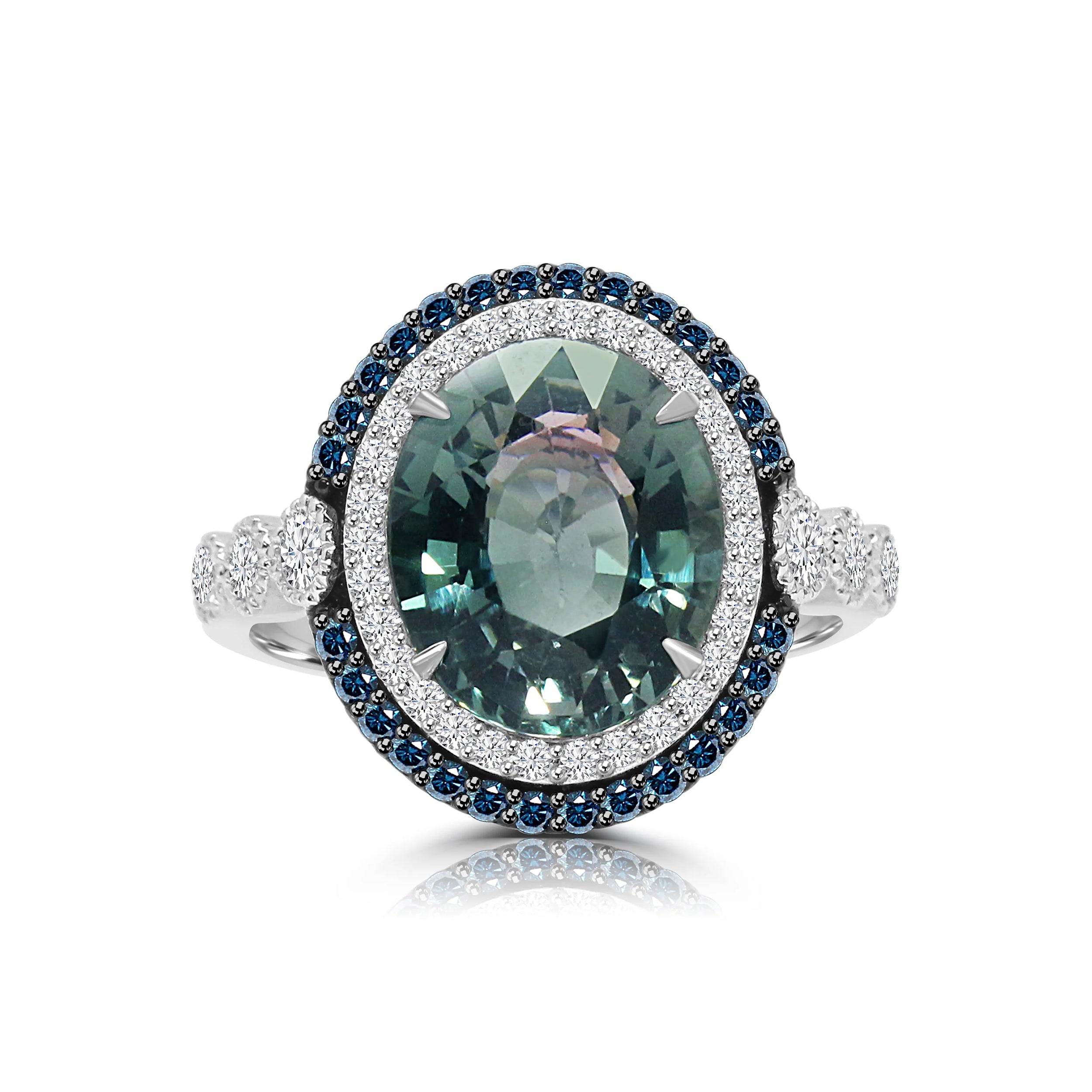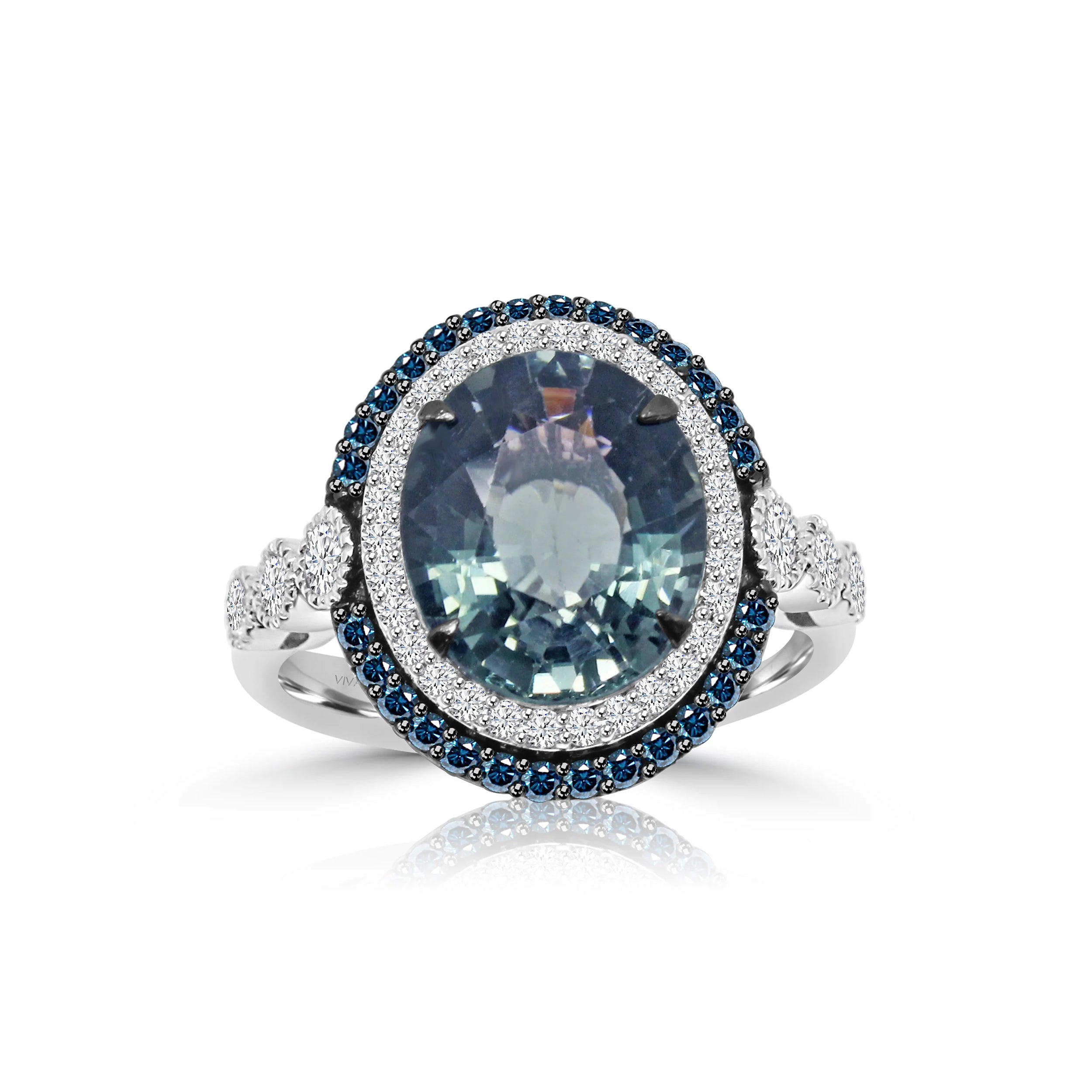 This captivating VITAE Tourmaline Gemstone Ring, renowned for its rich, vibrant color that captures the eye. The tourmaline is beautifully complemented by a dazzling arrangement of blue diamonds and brilliant white diamonds, adding an extra layer of sparkle and depth. The combination of these exquisite gemstones creates a striking contrast and a sophisticated allure, making this ring a perfect choice for those who appreciate both bold beauty and timeless elegance.