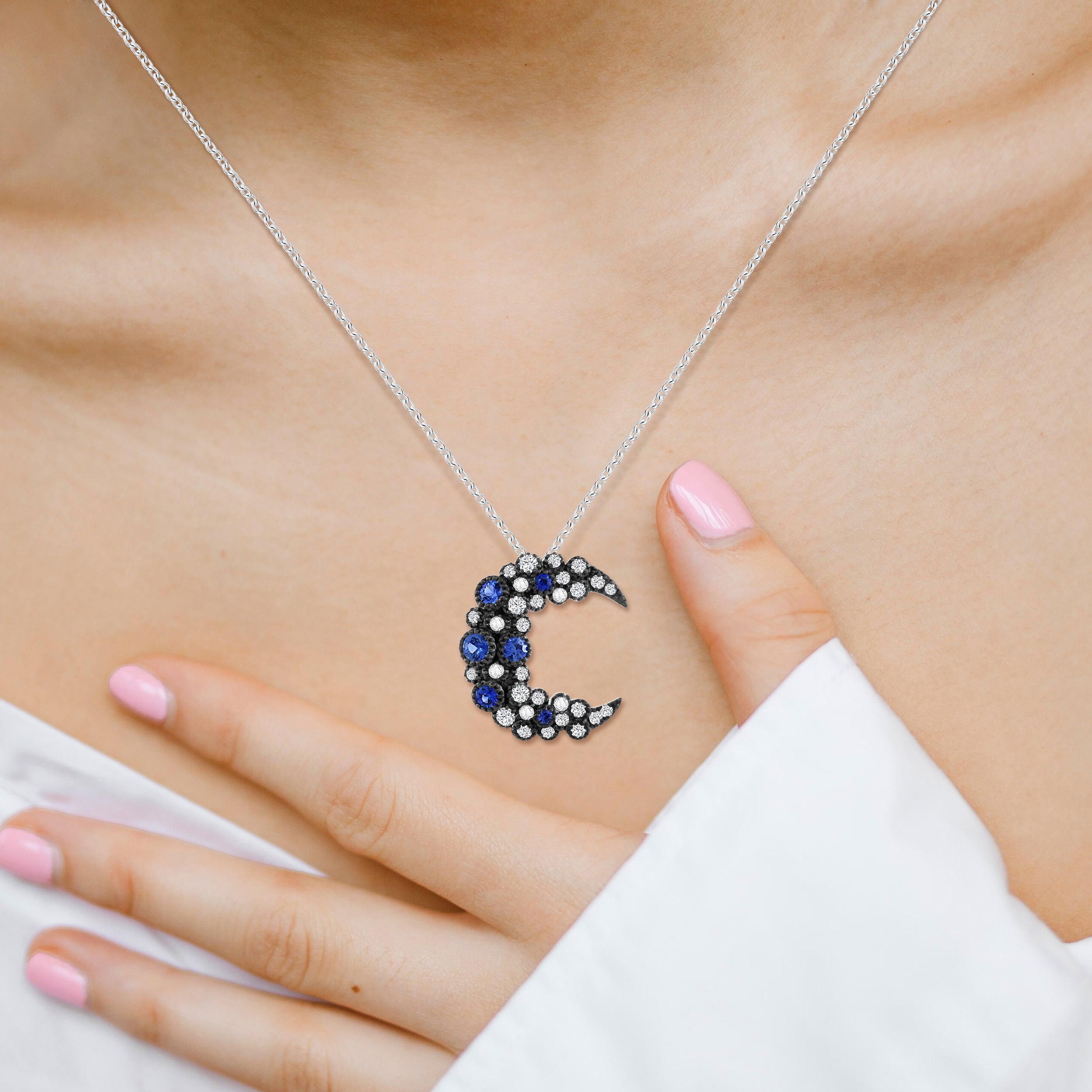 This classy crescent moon necklace is a lovely fusion of sophistication and celestial charm. It consists of a blackened gold setting and showcases a stunning array of sapphires and brilliant cut diamonds, creating a captivating shimmer. The delicate yet sophisticated design symbolizes dreams, intuition, and the beauty of the night sky. This timeless piece, hanging from a chic adjustable chain, makes for a perfect present regardless of the event. Worn alone or layered with other necklaces, it adds a touch of celestial shimmer to an ensemble. This charming crescent moon pendant is designed for modern-day dreamers—make it a part of your jewelry collection!