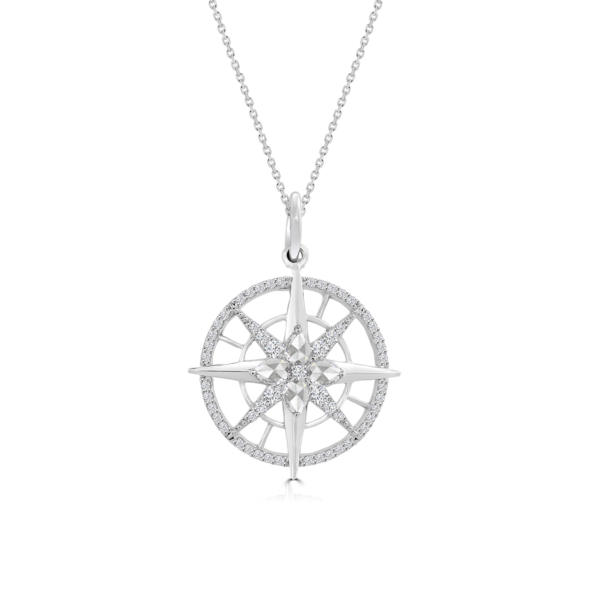 Inspired by direction and inner light, the CLARITY pendant is a striking symbol of guidance and elegance. At its center, four pear-shaped rose-cut diamonds form a radiant bloom, representing clarity in all directions. Brilliant-cut diamonds accent the delicate spikes and outer circle, creating a refined compass motif that shimmers with purpose. Set in luminous 18K white gold, this pendant is a timeless expression of balance, brilliance, and beautifully guided intention.