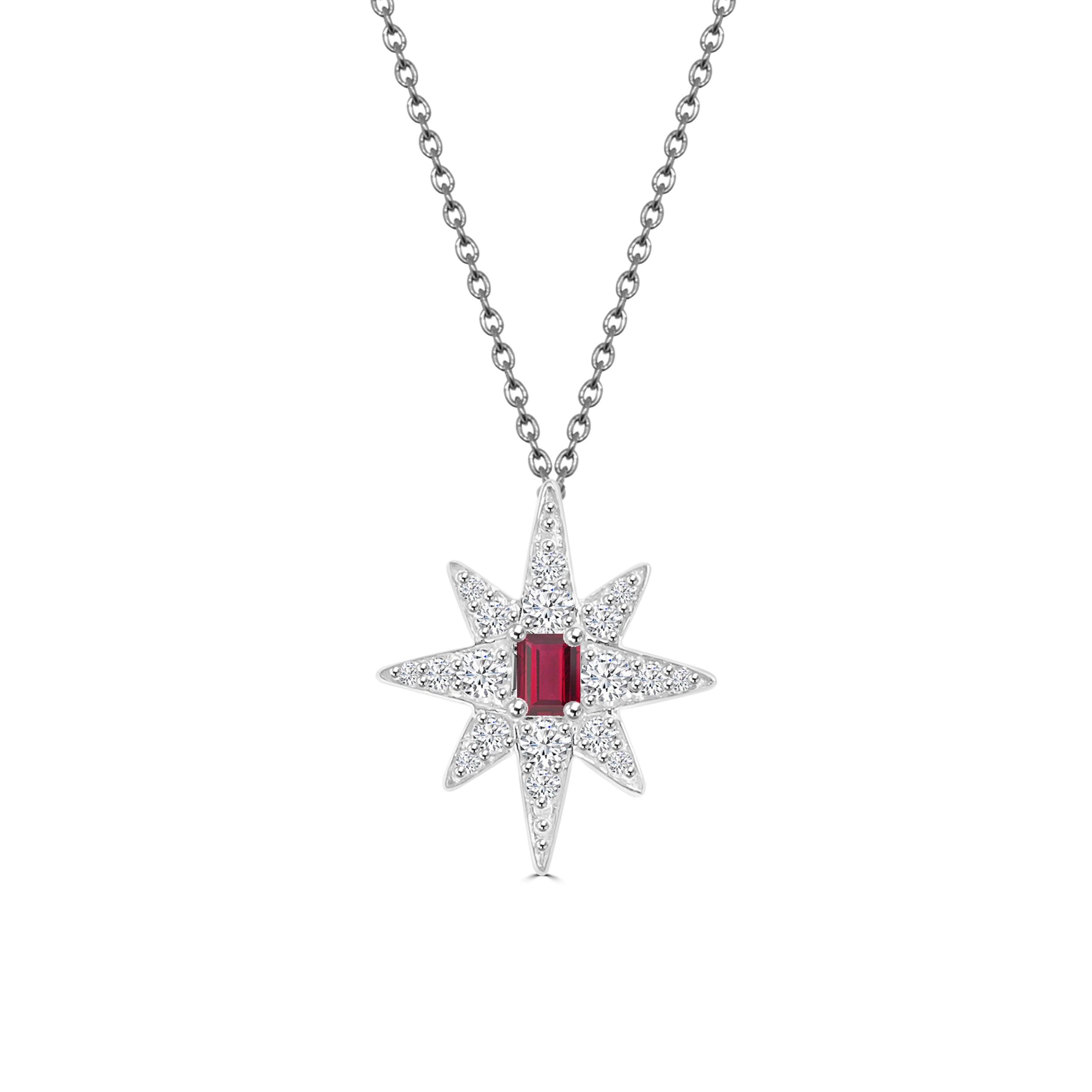 This beautiful starburst necklace will enhance your jewelry collection. This celestial-inspired piece, made of top-notch white gold, showcases a stunning eight-point star embellished with brilliant pavé-set diamonds. The necklace features a stunning emerald-cut red ruby at its center, which contributes to its bold elegance. This necklace, suspended from a delicate but sturdy chain, radiates timeless sophistication and charm. It serves as an ideal statement accessory for any event, whether donned by itself or in layers. This necklace, embodying brilliance and sophistication, makes a perfect present for a loved one or an extravagant indulgence for yourself.