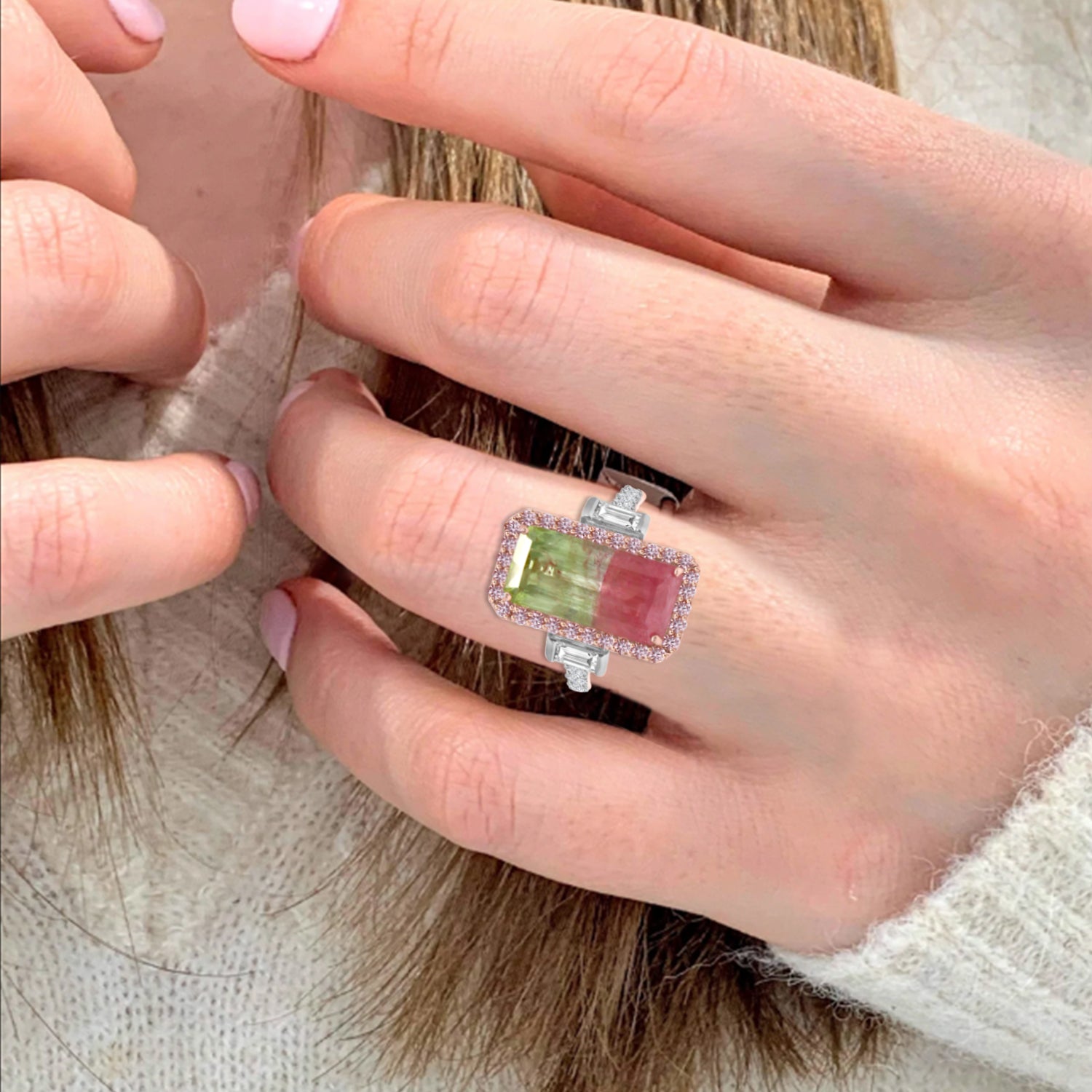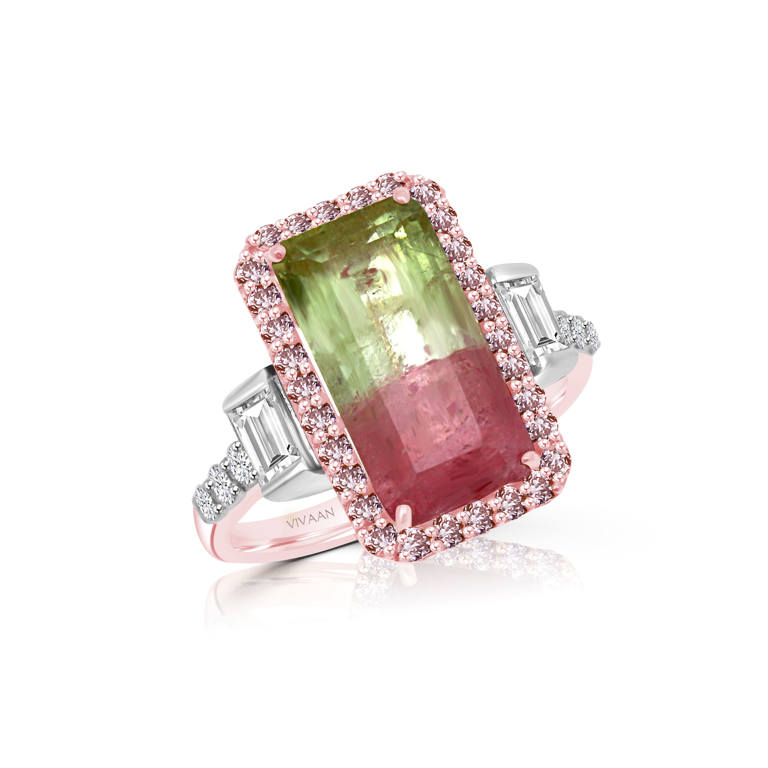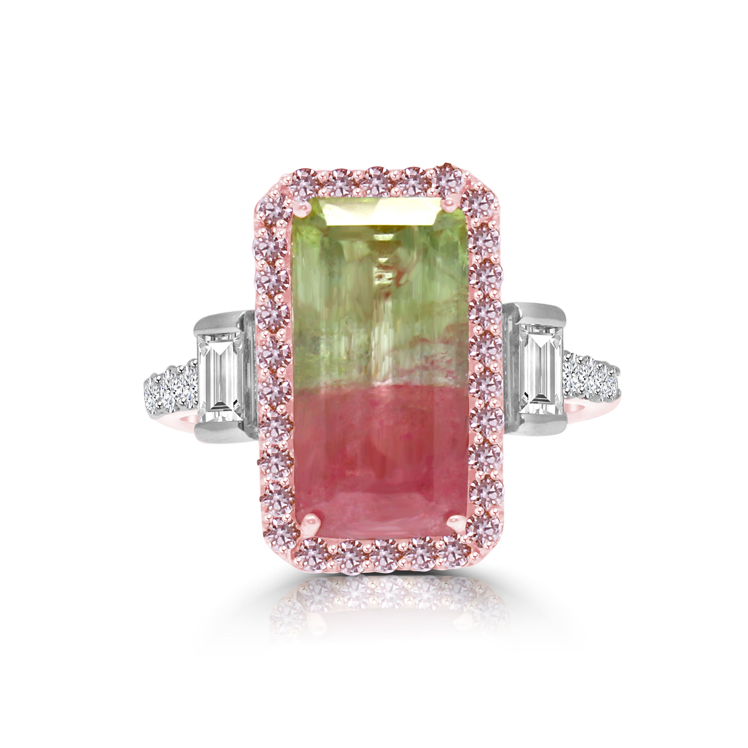 Ring featuring Tourmaline framed in rare Natural Pink Diamonds and accented with Diamond Baguettes on sides on a shank studded with Brilliant Cut Diamonds set in 18K White Gold and Pink Rhodium.