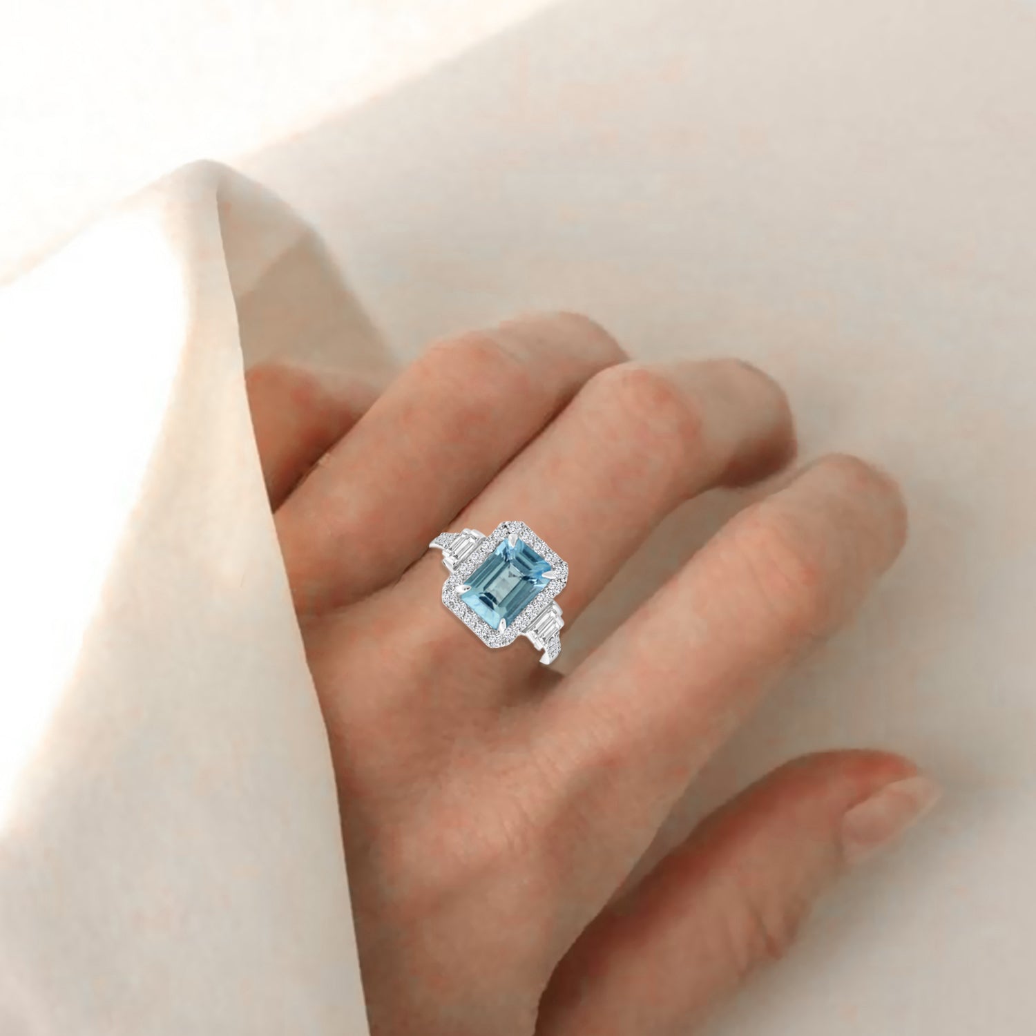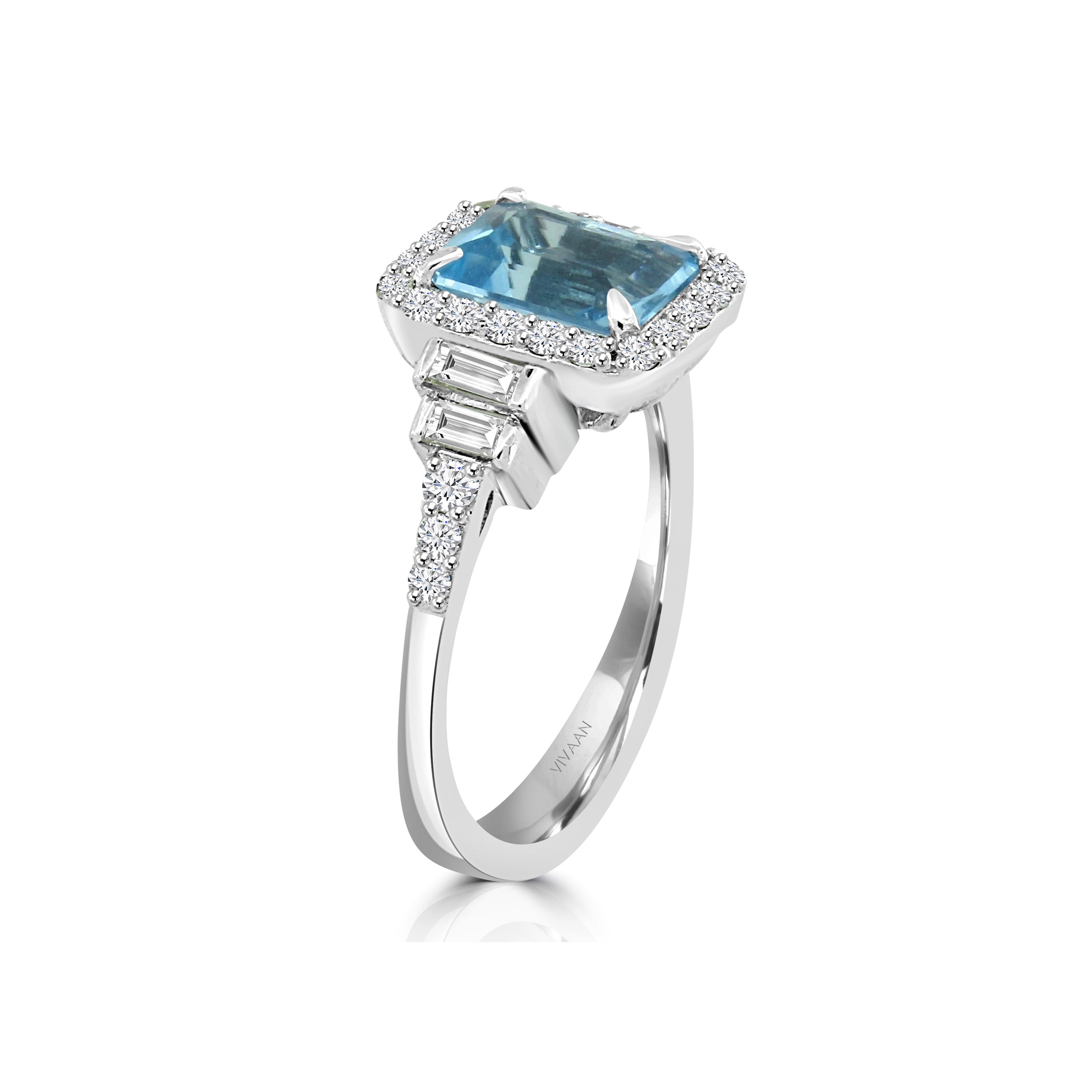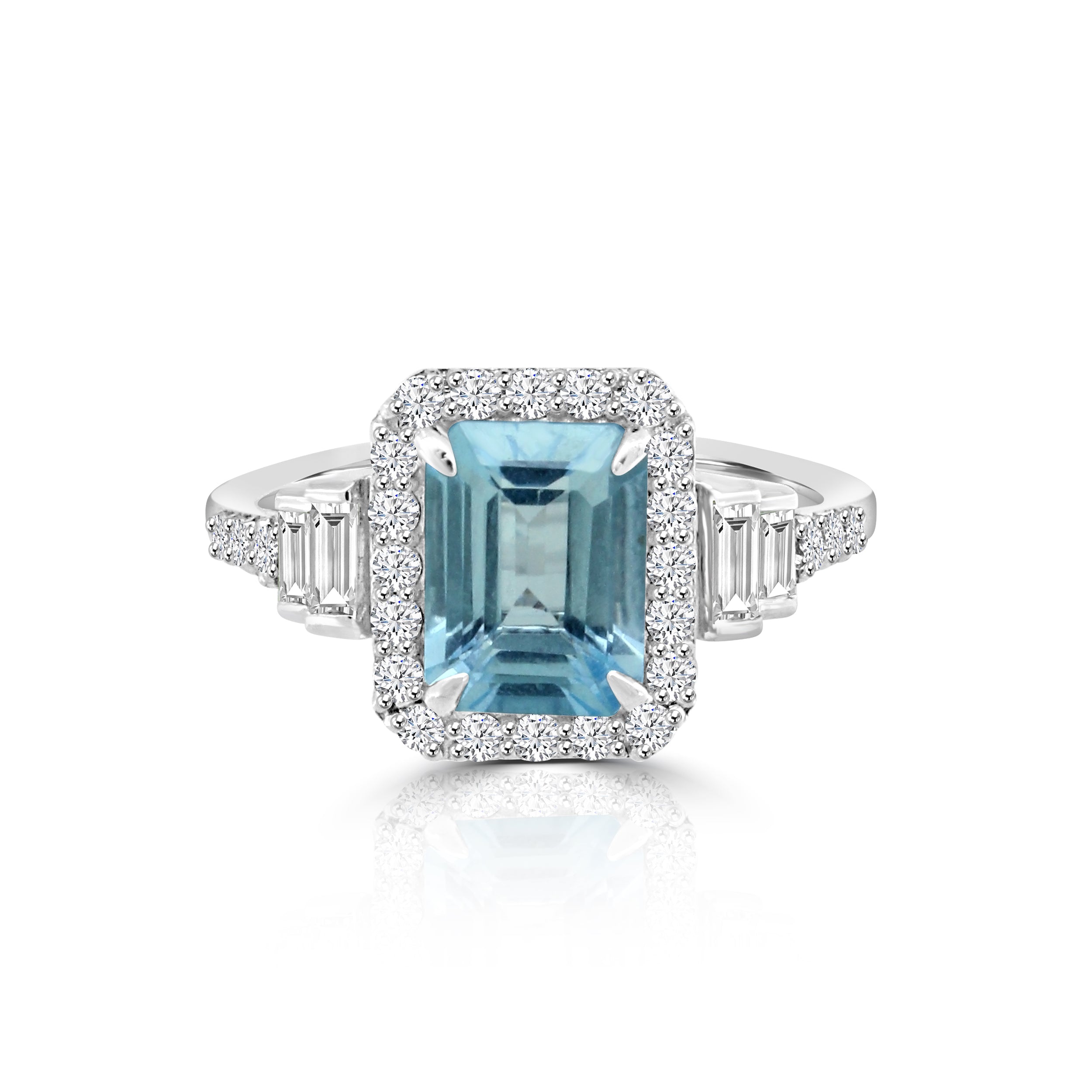 Make a timeless statement with XENA, a beautiful aquamarine ring encased in 18K white gold and set with stunning diamond baguettes and brilliant diamonds. Catch the light in any setting with its undeniable brilliance and radiance. A fashionable addition to any look.