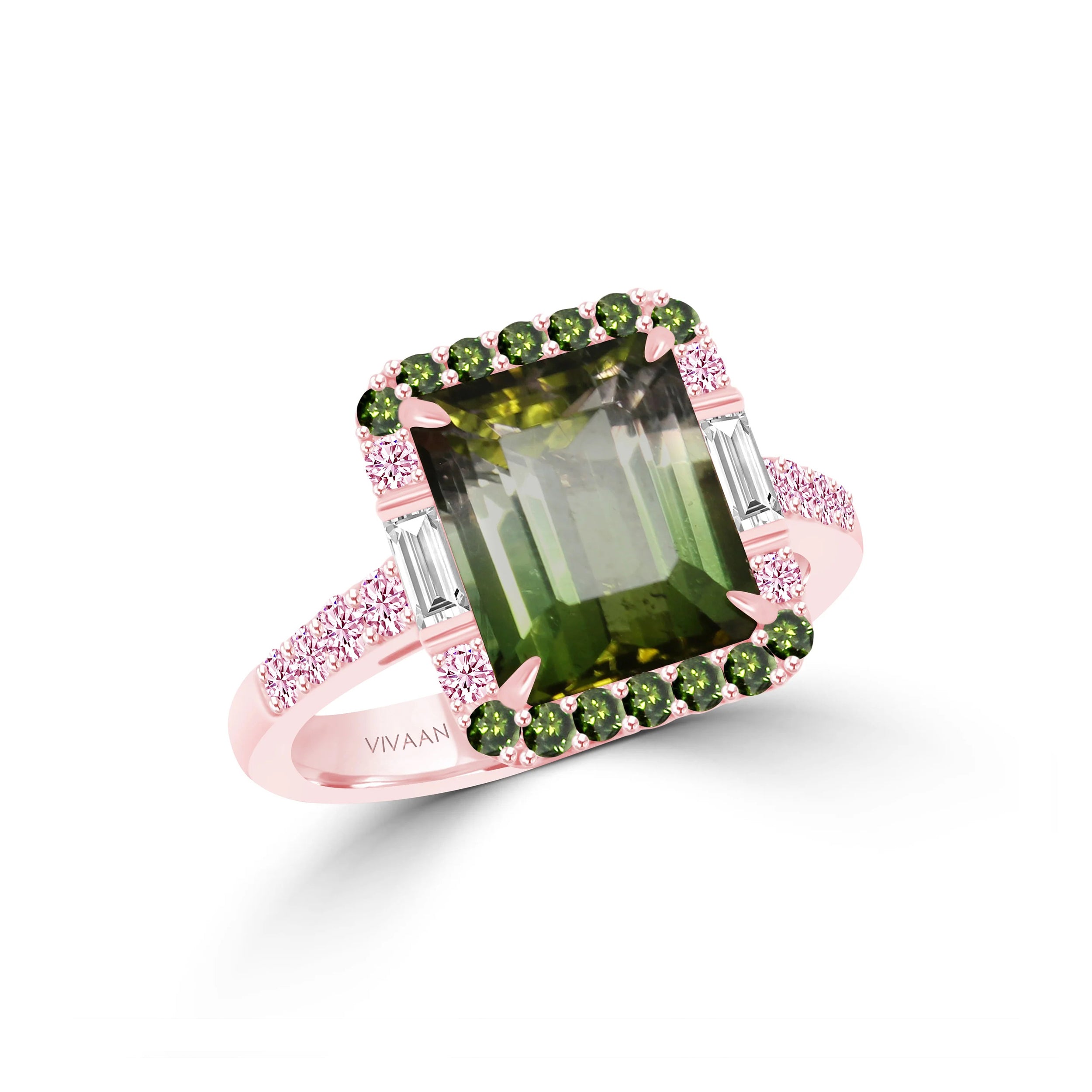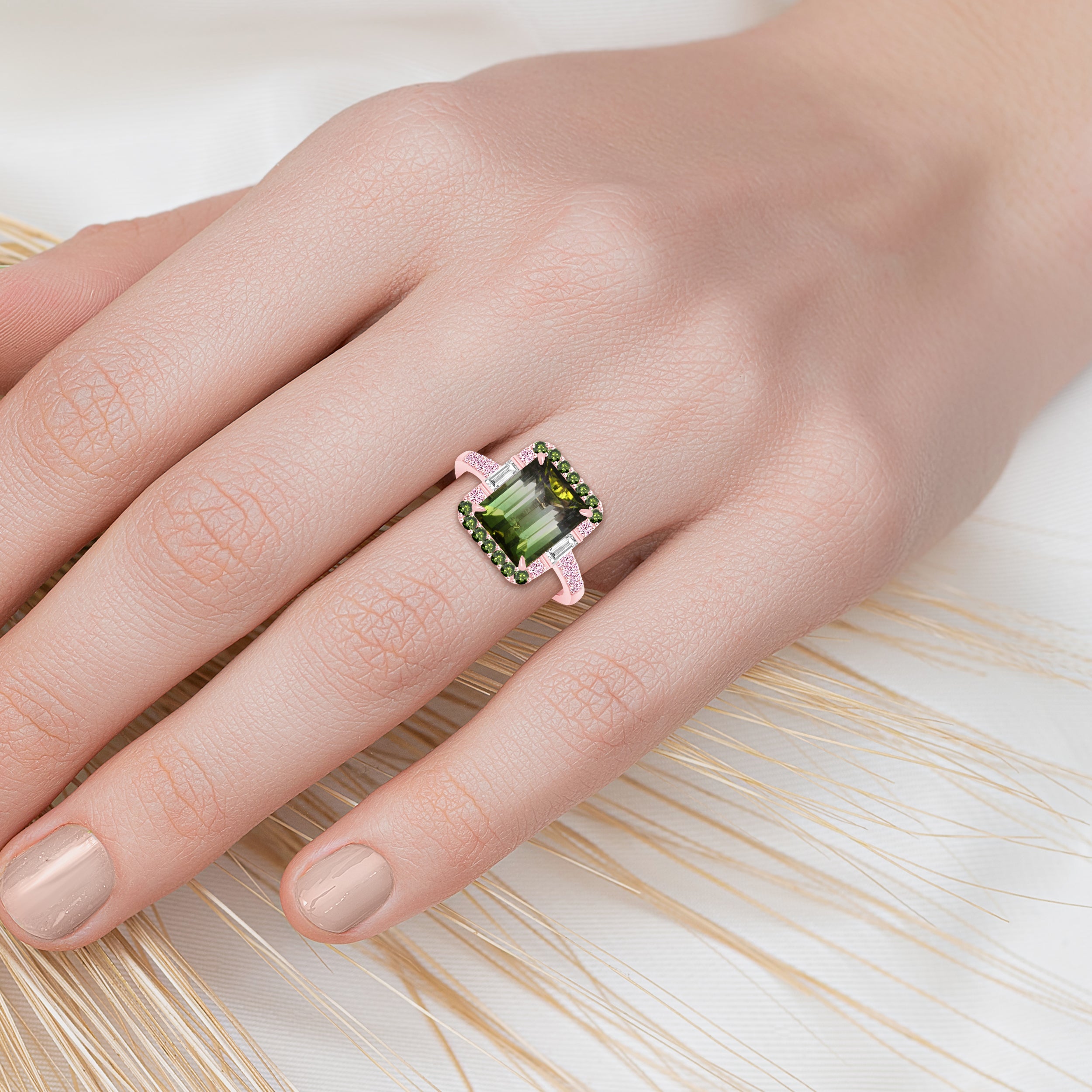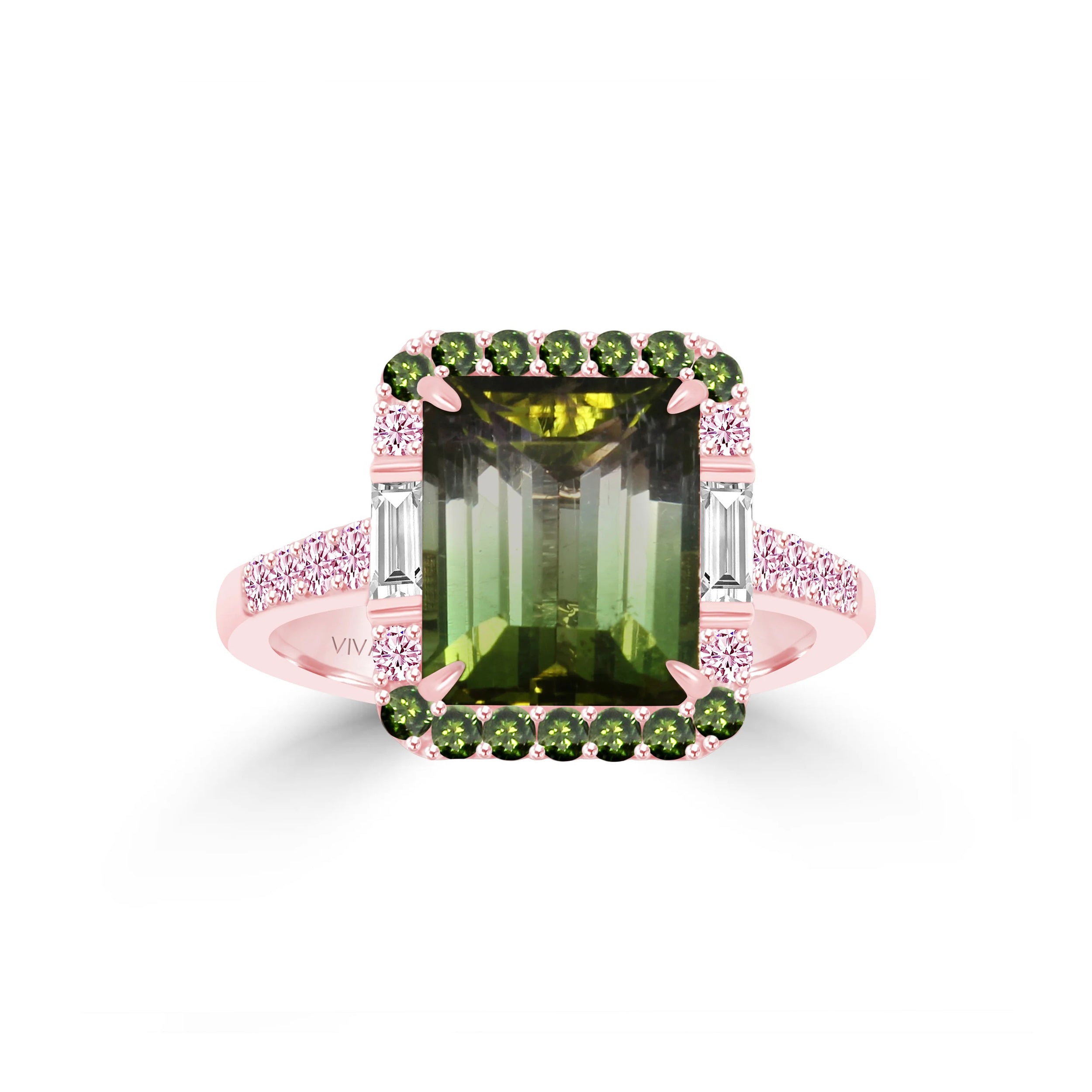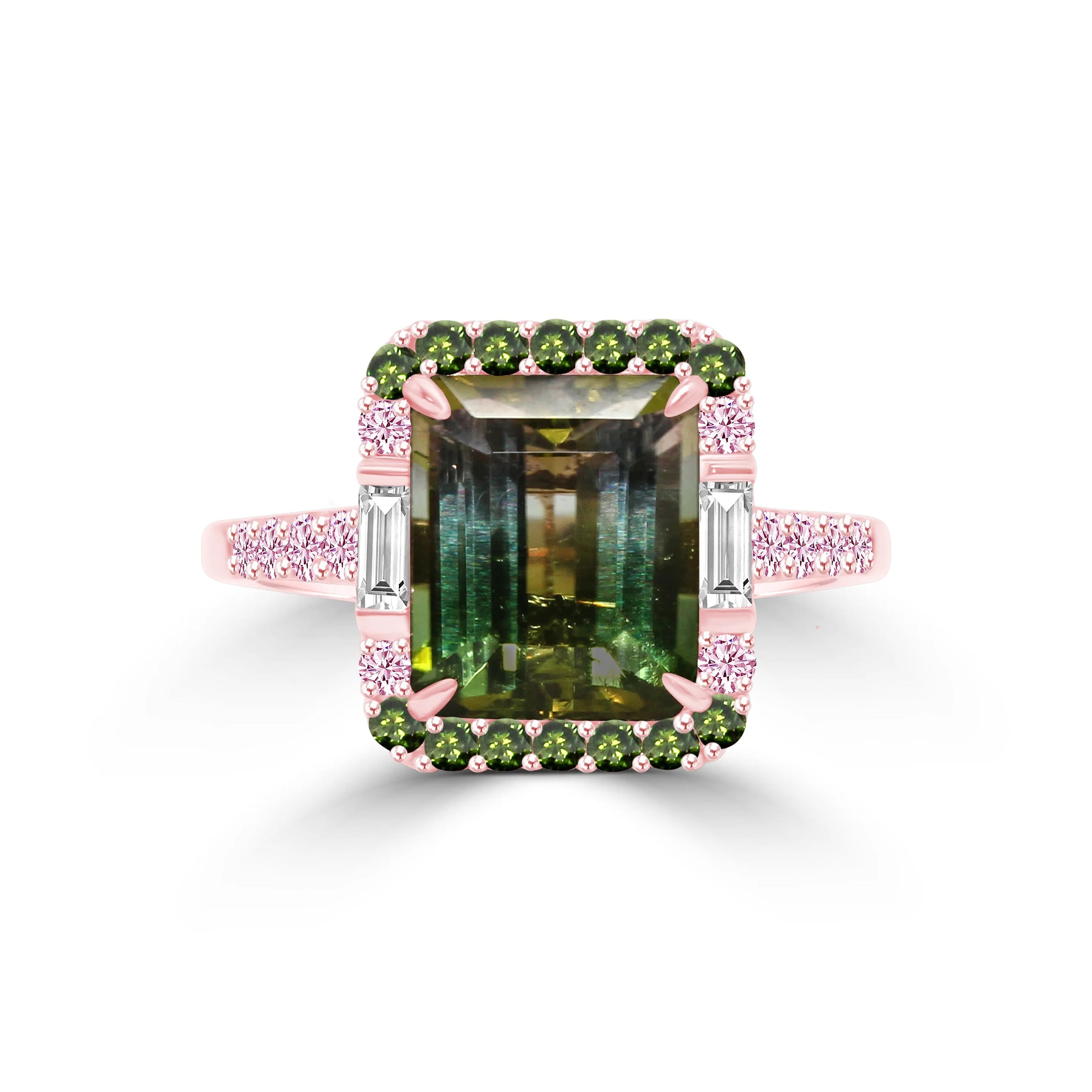 The VERDANT MIST ring is a vibrant masterpiece, capturing the essence of the earth’s most beautiful colors. At its core, a deep green tourmaline glows with rich, organic beauty, while baguette diamonds on the sides add a sleek touch of elegance. Surrounded by a halo of pink, green, and brilliant diamonds, the design radiates with a stunning blend of hues that dance together in perfect harmony.