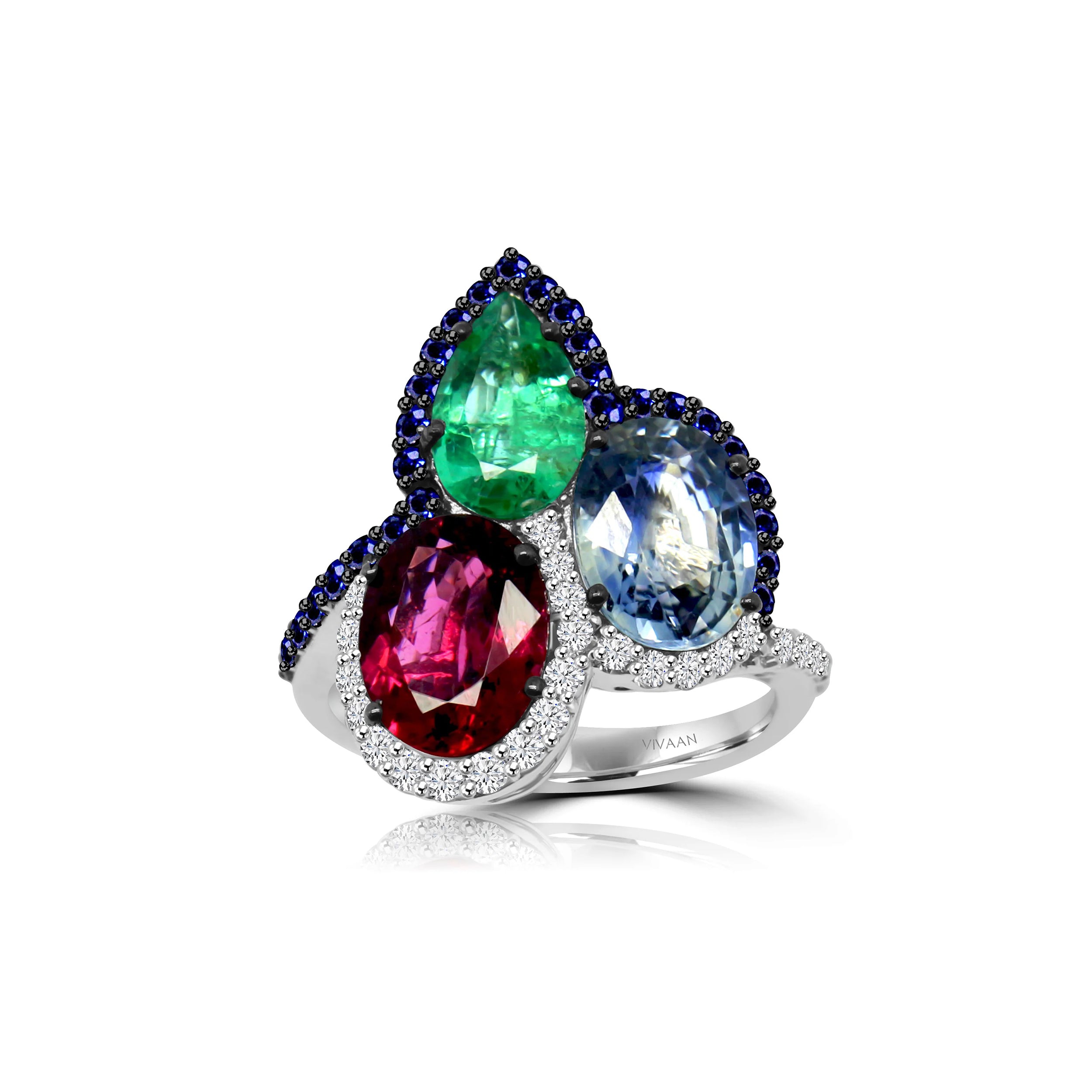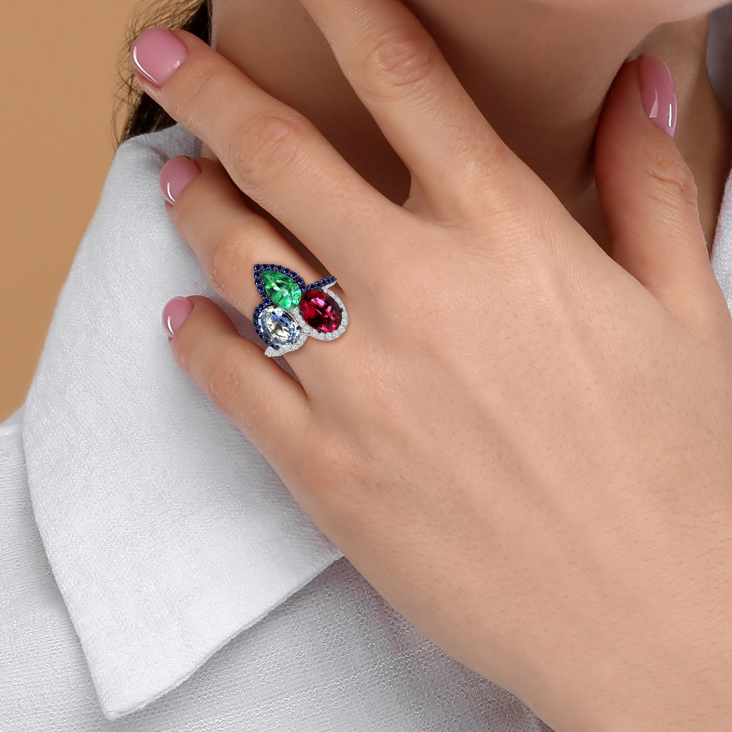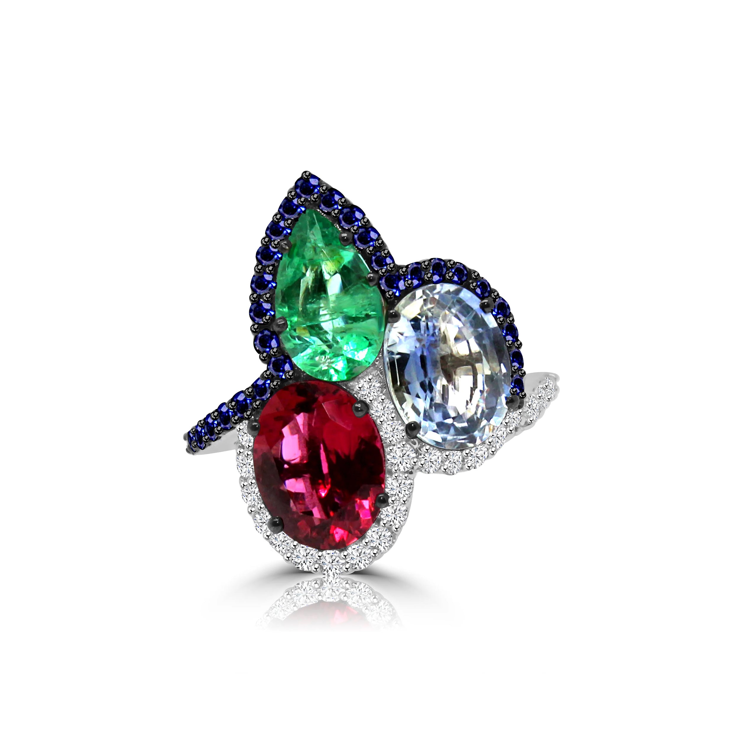The *ZARA* ring is a captivating celebration of color and sophistication. Showcasing a trio of exquisite gemstones—emerald, tourmaline, and sapphire—each radiating its own unique brilliance, this design is a harmonious blend of vibrant beauty. Accented with sparkling brilliant-cut diamonds, the *ZARA* ring exudes refined glamour and elegance.