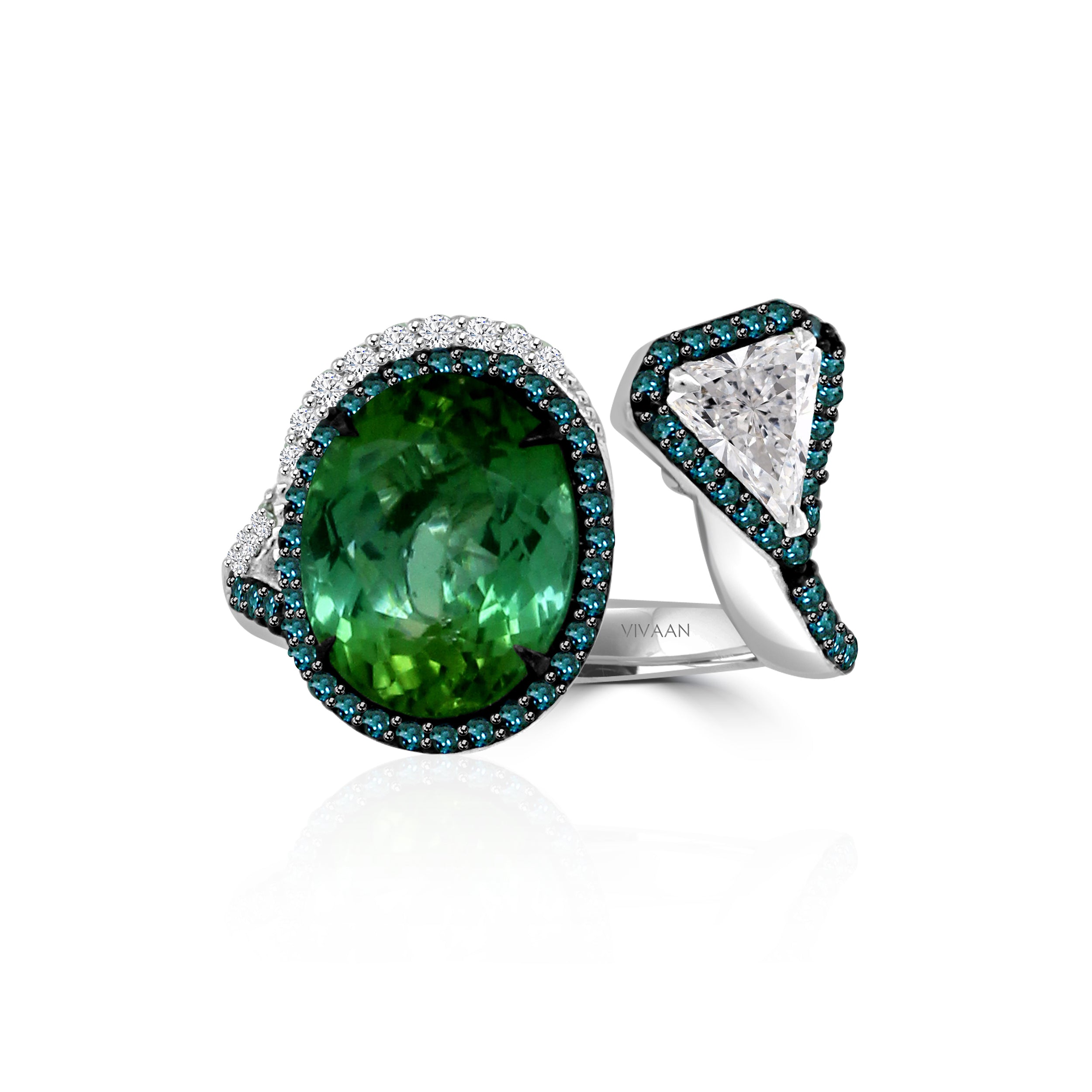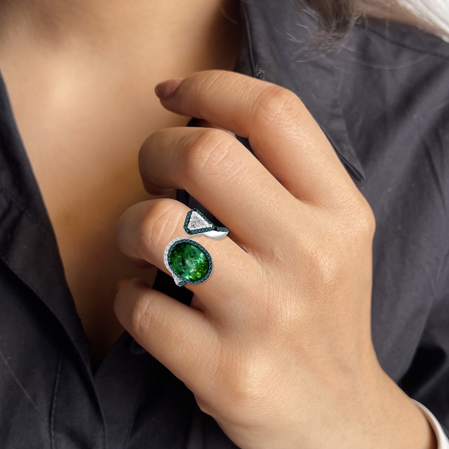Ready to sparkle!! This ZOLA tourmaline open ring is the perfect choice for anyone who wants to shine. The impressive 18K white gold setting hosts a stunning tourmaline with blue diamond, accompanied by a fancy brilliant diamond, making this piece a real showstopper. Take your look to the next level with this stand-out piece!
