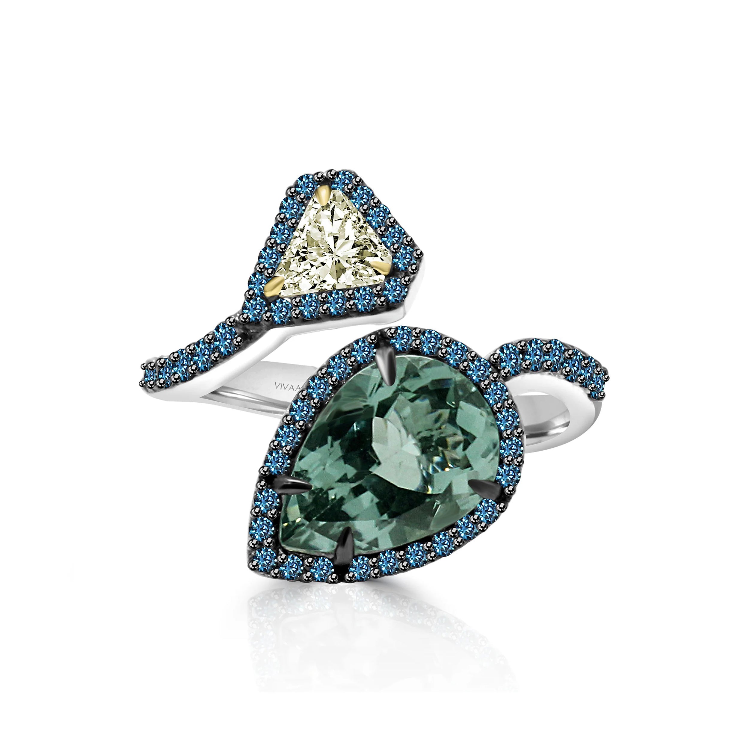 The ZYVEL Toi et Moi ring is where bold meets brilliance! Featuring a vibrant green tourmaline paired with a stunning fancy-shaped diamond, this duo is all about playful contrasts. Accented with sparkling blue diamonds, the ring adds a pop of color and fun to your style.